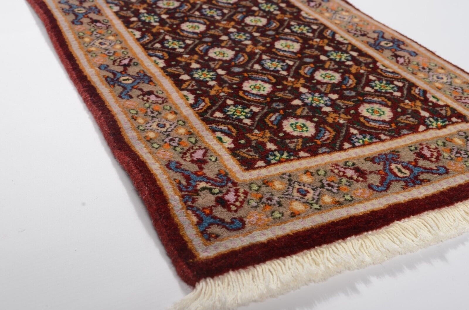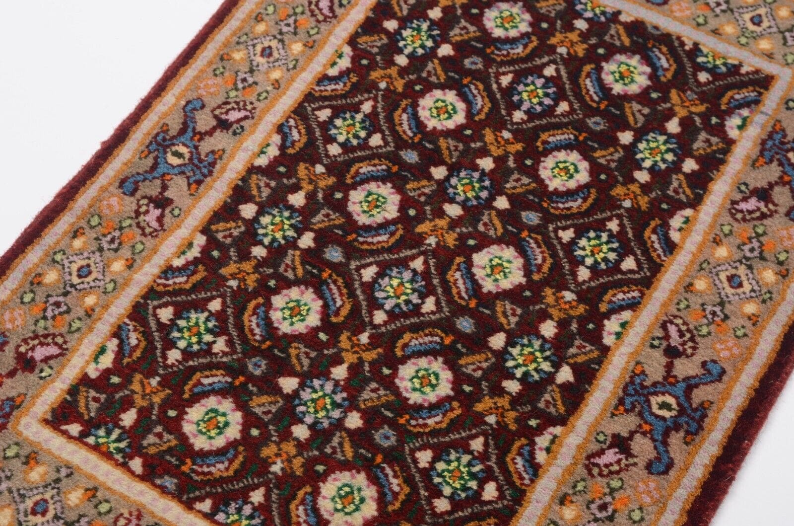 Handgeknüpfter Perserteppich Moud | Größe: 60 x 40 cm | Knotendichte: 300.000 Knoten/m² | Material: 100% Schurwolle, 100% Baumwolle (Kette) | Zustand: Neu, perfekt | Muster: Orientalisches Heratimuster | Dicke: ca. 10 mm | Herkunft: Nordost-Persien | Verwendung: Auch als Autofußmatte geeignet | Stil: Traditionell Orientalisch/Persisch | Für Fußbodenheizung geeignet
