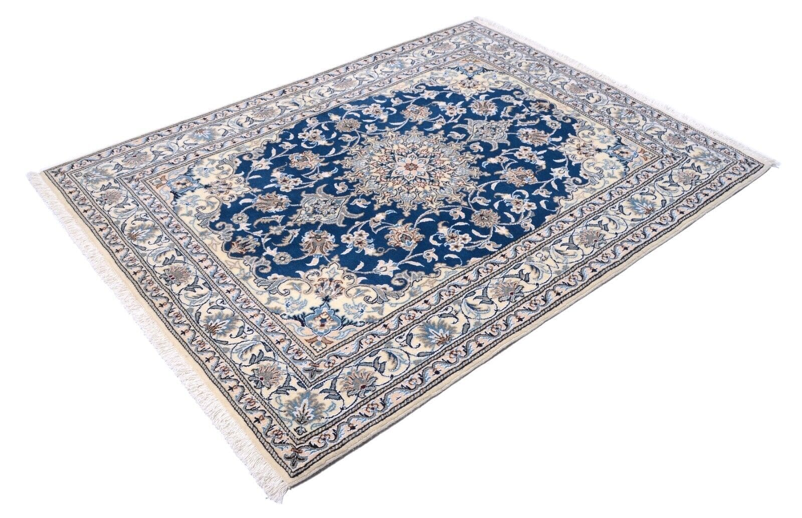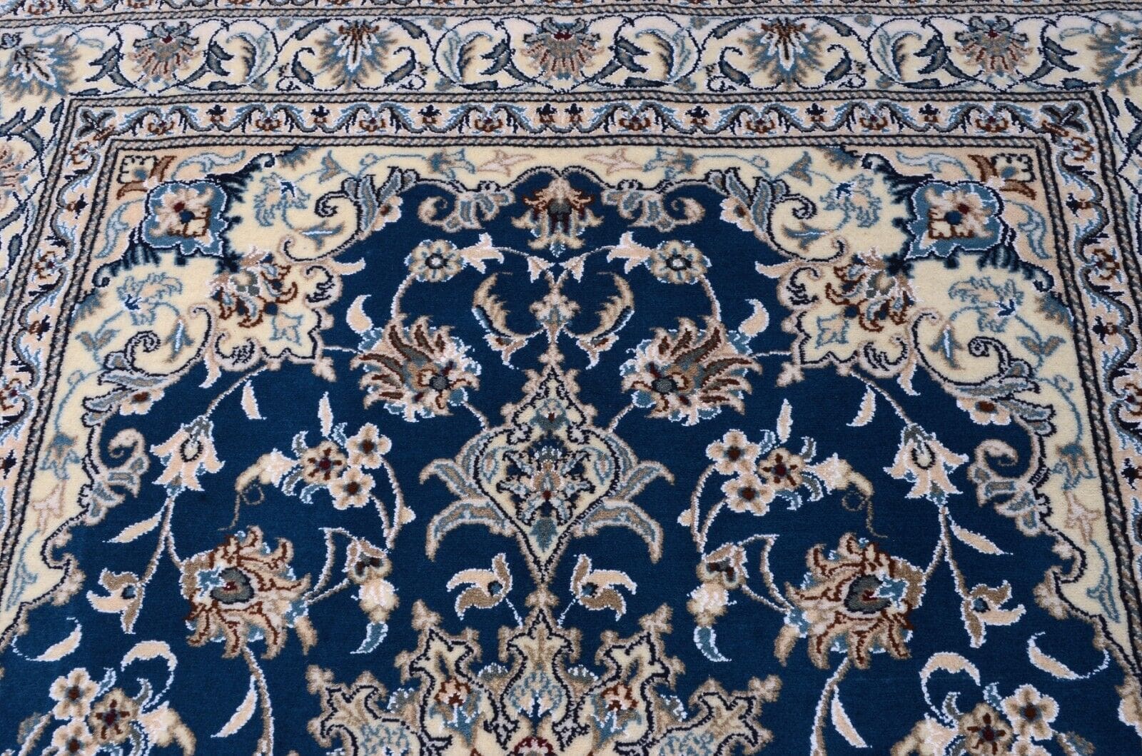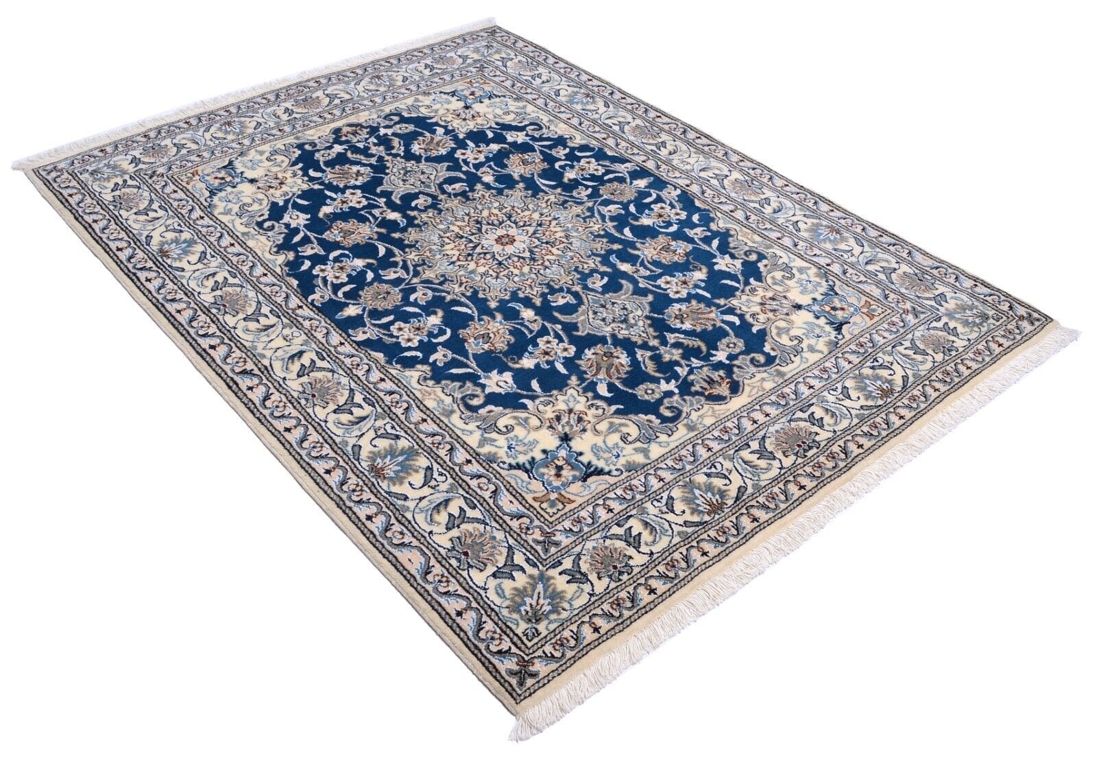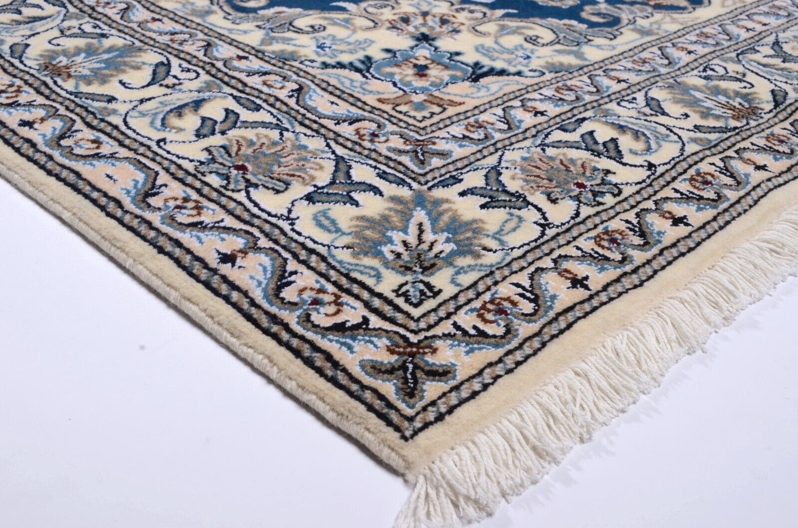 Handgeknüpfter Perserteppich Nain 197 x 147 cm – 300.000 Knoten/m², Royalblau, Floralmotiv mit Medaillon, Neu