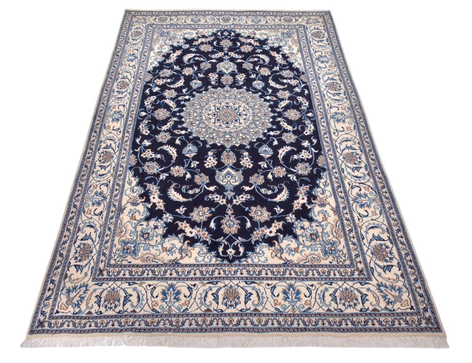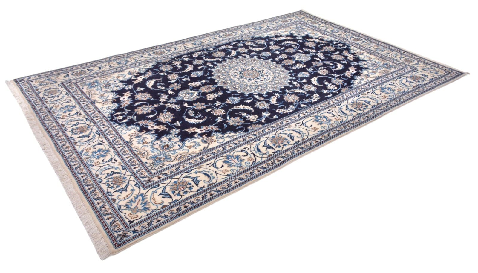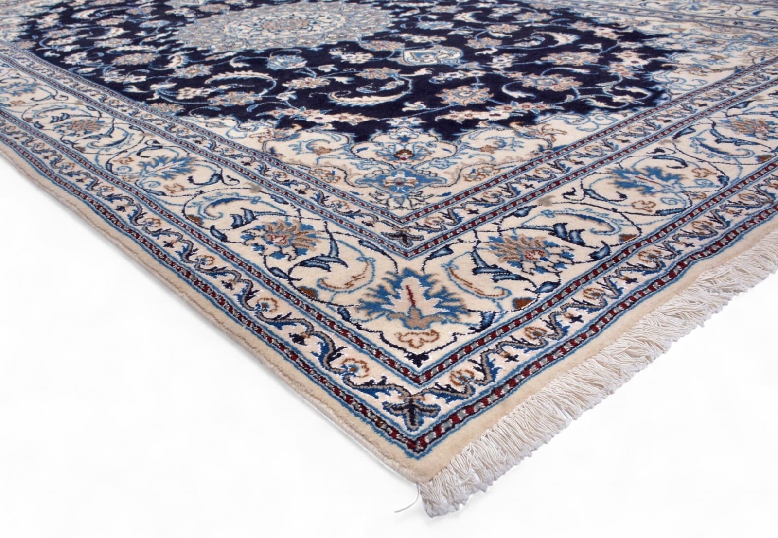 Handgeknüpfter Orientteppich Nain | Knotendichte: 300.000 Knoten/m² | Material: 100% hochwertige Wolle | Größe: 312 x 201 cm | Zustand: Neu, perfekt | Herkunft: Zentral-Persien | Muster: Floralmotiv mit Medaillon | Dicke: ca. 12 mm | Besonderheiten: Für Fußbodenheizung geeignet, haustierfreundlich, hohe Farbbeständigkeit