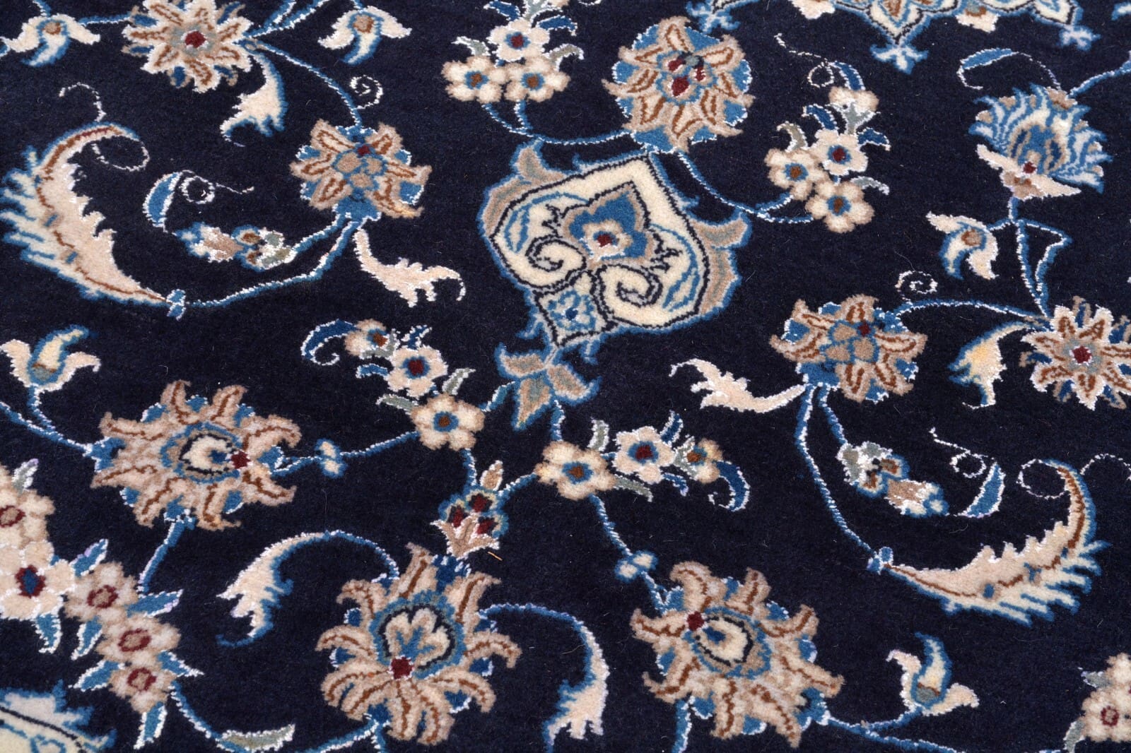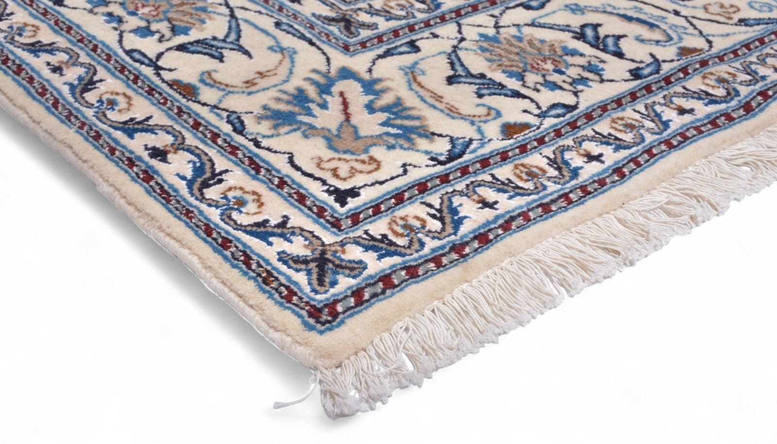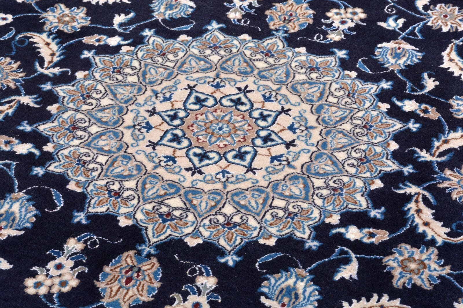 Handgeknüpfter Orientteppich Nain | Knotendichte: 300.000 Knoten/m² | Material: 100% hochwertige Wolle | Größe: 312 x 201 cm | Zustand: Neu, perfekt | Herkunft: Zentral-Persien | Muster: Floralmotiv mit Medaillon | Dicke: ca. 12 mm | Besonderheiten: Für Fußbodenheizung geeignet, haustierfreundlich, hohe Farbbeständigkeit