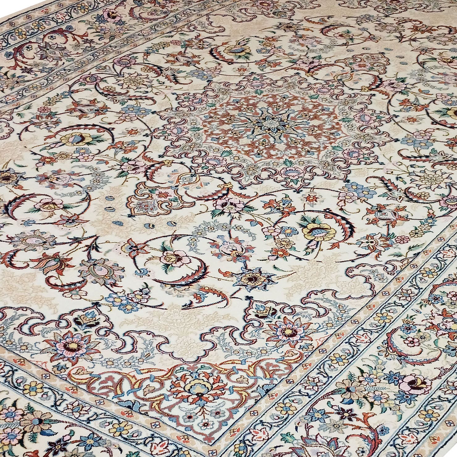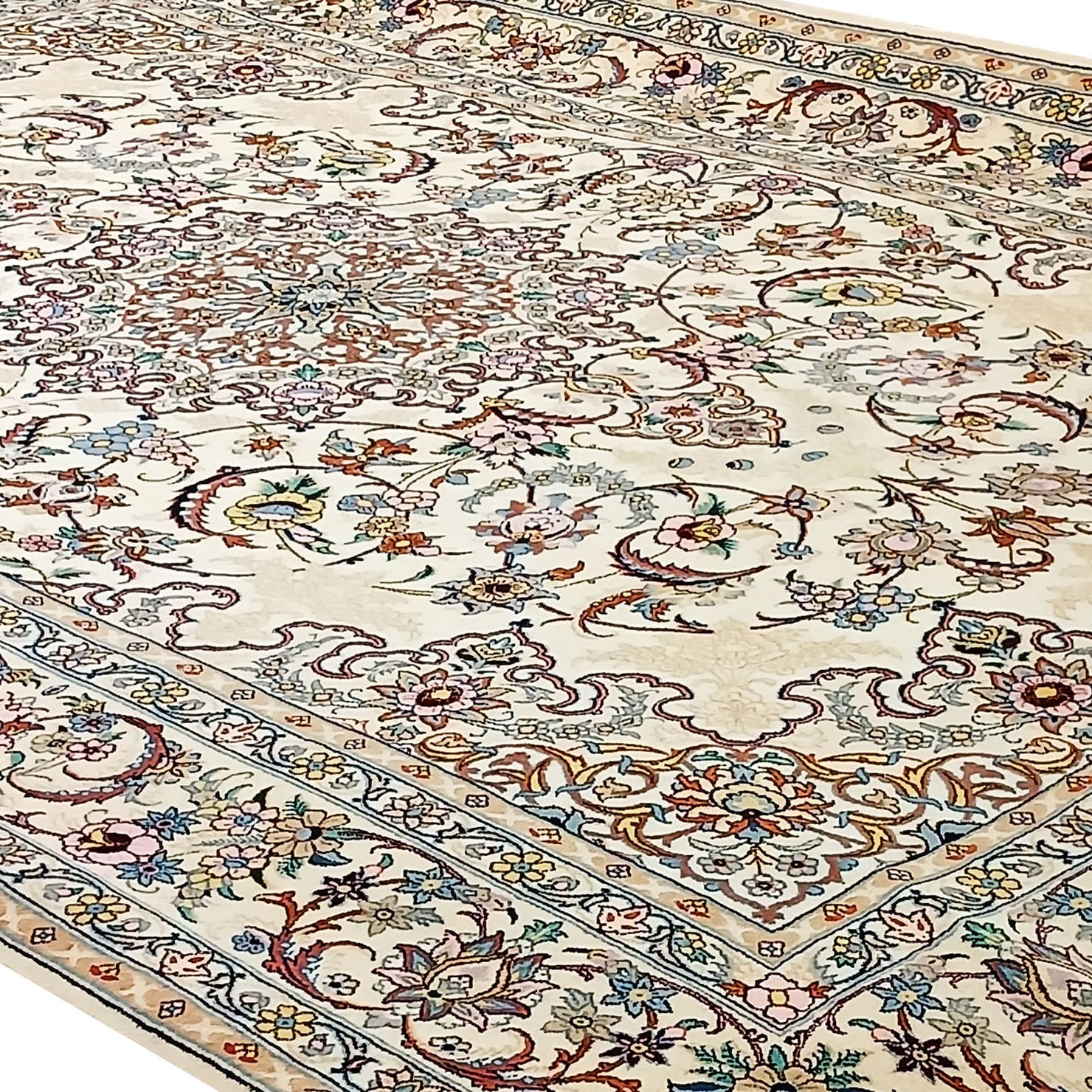 Handgeknüpfter Nain Orientteppich | 9 La (≈ 45 Raj) | Knotendichte: ca. 500.000 / m² | Flor: Wolle & Seide (15 % Seide), Kette: Baumwolle | Größe: 320 x 210 cm | Herkunft: Nain | Farbe: creme, Bordüre: beige | Zustand: neu | Hinweis: Bei Unikaten bitte vor Bestellung die Verfügbarkeit prüfen