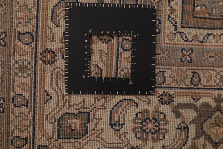 Handgewebter Sarough Teppich | Knotendichte: 128.000-160.000 Knoten/m² | Material: Hochwertige Wolle | Größe: 307×241 cm | Muster: Herati mit stilisierten Blumenmotiven | Farbe: Beige- und Brauntöne | Zustand: Neu | Ursprung: Indien | Dicke: ca. 10 mm | Gewicht: ca. 22 kg