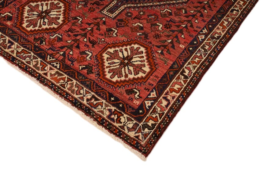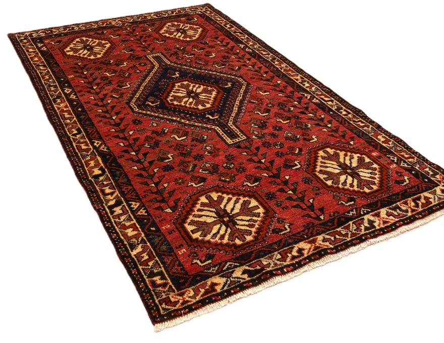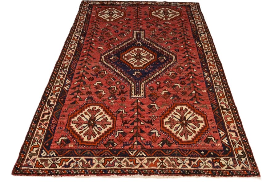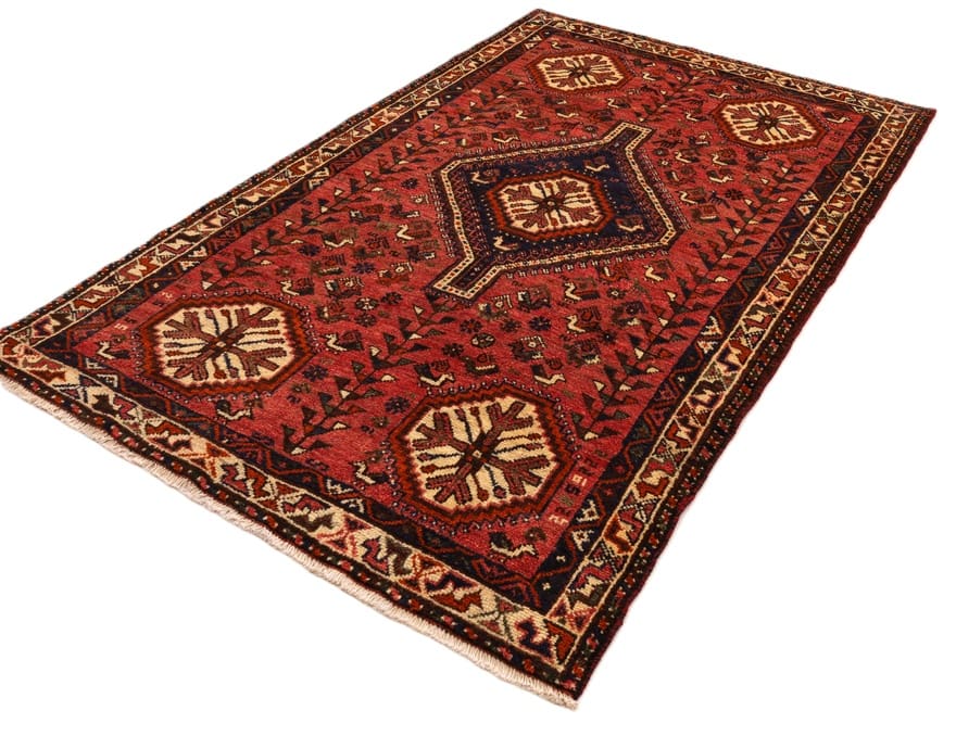 Handgeknüpfter Shiraz-Teppich | Knotendichte: 128.000 – 160.000 Knoten/m² | Material: Hochwertige Wolle | Größe: 254×160 cm | Farbe: Kräftige Rottöne | Zustand: Neuzeitlich (0-20 Jahre) | Ursprung: Iran/Persien