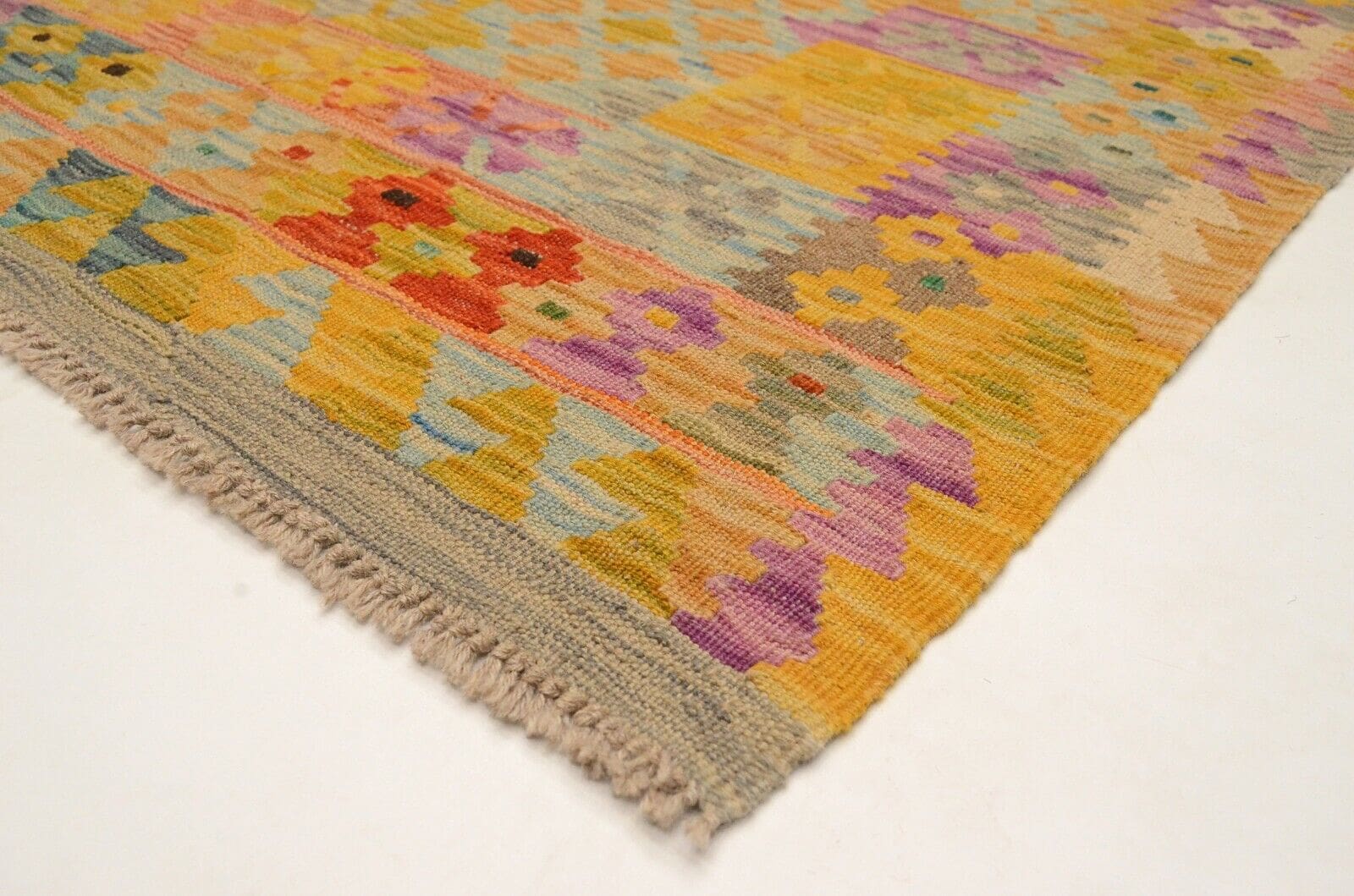 Der Afghan Kelim wird aus reinem Schafswolle gefertigt, was zu seiner Robustheit und Langlebigkeit beiträgt. Die handgewebte Technik ermöglicht eine präzise Verarbeitung, die sich in der hohen Knotendichte und der ausgezeichneten Qualität des Teppichs widerspiegelt. Diese Teppiche sind nicht nur optisch ansprechend, sondern auch funktional: Sie sind pflegeleicht und widerstandsfähig gegen Abnutzung, was sie ideal für Wohnräume und Flure macht.