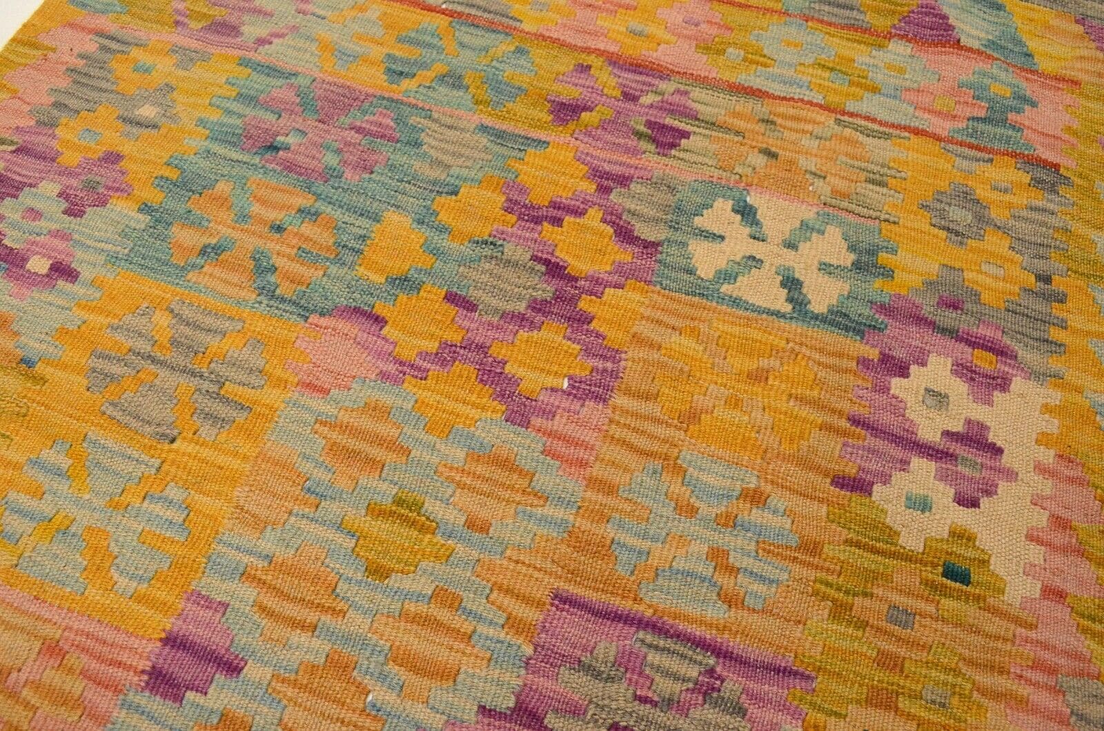 Entdecken Sie die Schönheit und den Charme eines handgewebten Afghan Kelims, der sich durch seine pastellfarbenen Nuancen mit einer harmonischen Farbpalette auszeichnet. Dieser Teppich vereint traditionelle Handwerkskunst mit modernen Designansätzen und verleiht jedem Raum eine warme und einladende Atmosphäre.