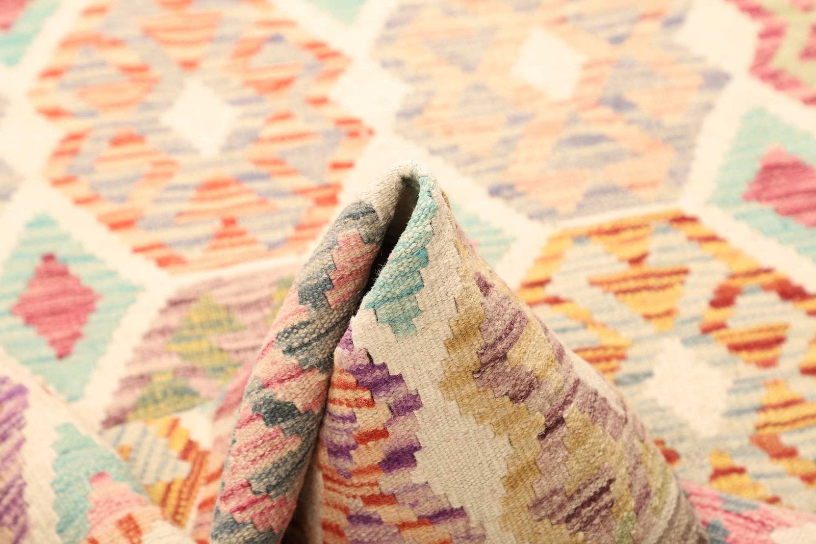 Der handgewebte Kelim ist aus hochwertiger Schurwolle gefertigt, die nicht nur für ihre Weichheit geschätzt wird, sondern auch für ihre Robustheit und Langlebigkeit. Diese Naturfaser sorgt dafür, dass der Teppich resistent gegen Abnutzung ist und gleichzeitig einen hohen Komfort bietet. Schurwolle ist zudem von Natur aus schmutzabweisend, was die Pflege und Reinigung erleichtert. Die handgewebte Technik ermöglicht es, feinste Details und Muster im Teppich zu verewigen, was jedes Stück zu einem Unikat macht.