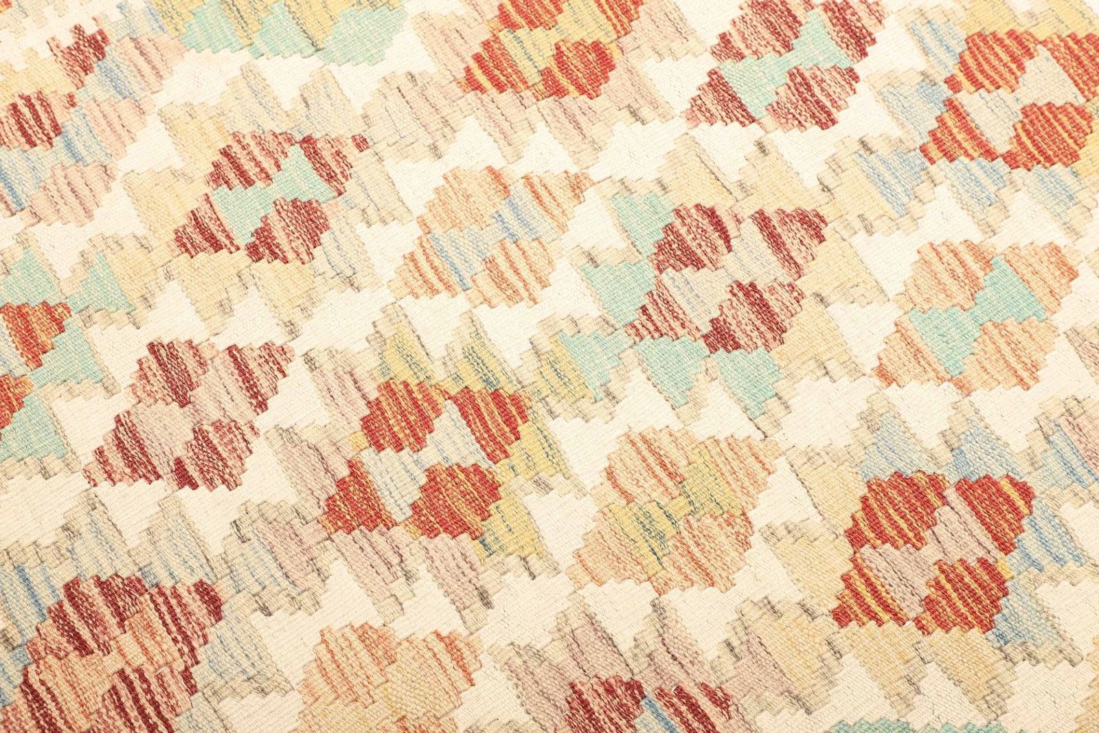 Der Kelim besteht aus 100 % hochwertiger Schurwolle, was ihn besonders strapazierfähig und pflegeleicht macht. Schurwolle ist nicht nur weich und angenehm unter den Füßen, sondern hat auch die Fähigkeit, Feuchtigkeit zu regulieren und geruchsneutral zu bleiben. Dies macht ihn ideal für den täglichen Gebrauch in Wohnräumen, Fluren und sogar in Kinderzimmern. Bei der handgewebten Technik werden die Naturfasern kunstvoll miteinander verwoben, was dem Teppich seine einzigartige Struktur und Beständigkeit verleiht.