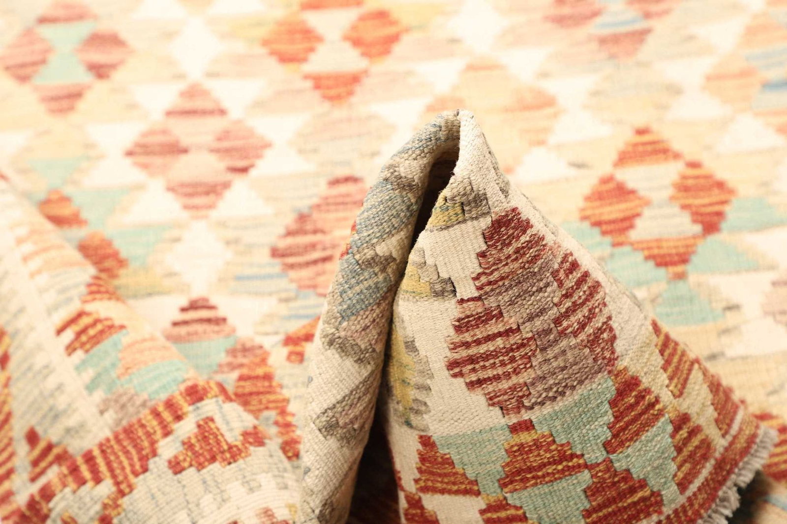 Der handgewebte Kelim vereint eine harmonische Palette von Erdtönen, die perfekt mit zahlreichen Einrichtungsstilen harmoniert. Von sanften Beigetönen bis hin zu tiefen Braun- und Rottönen – der Teppich fügt sich farblich ideal in Ihr Zuhause ein.