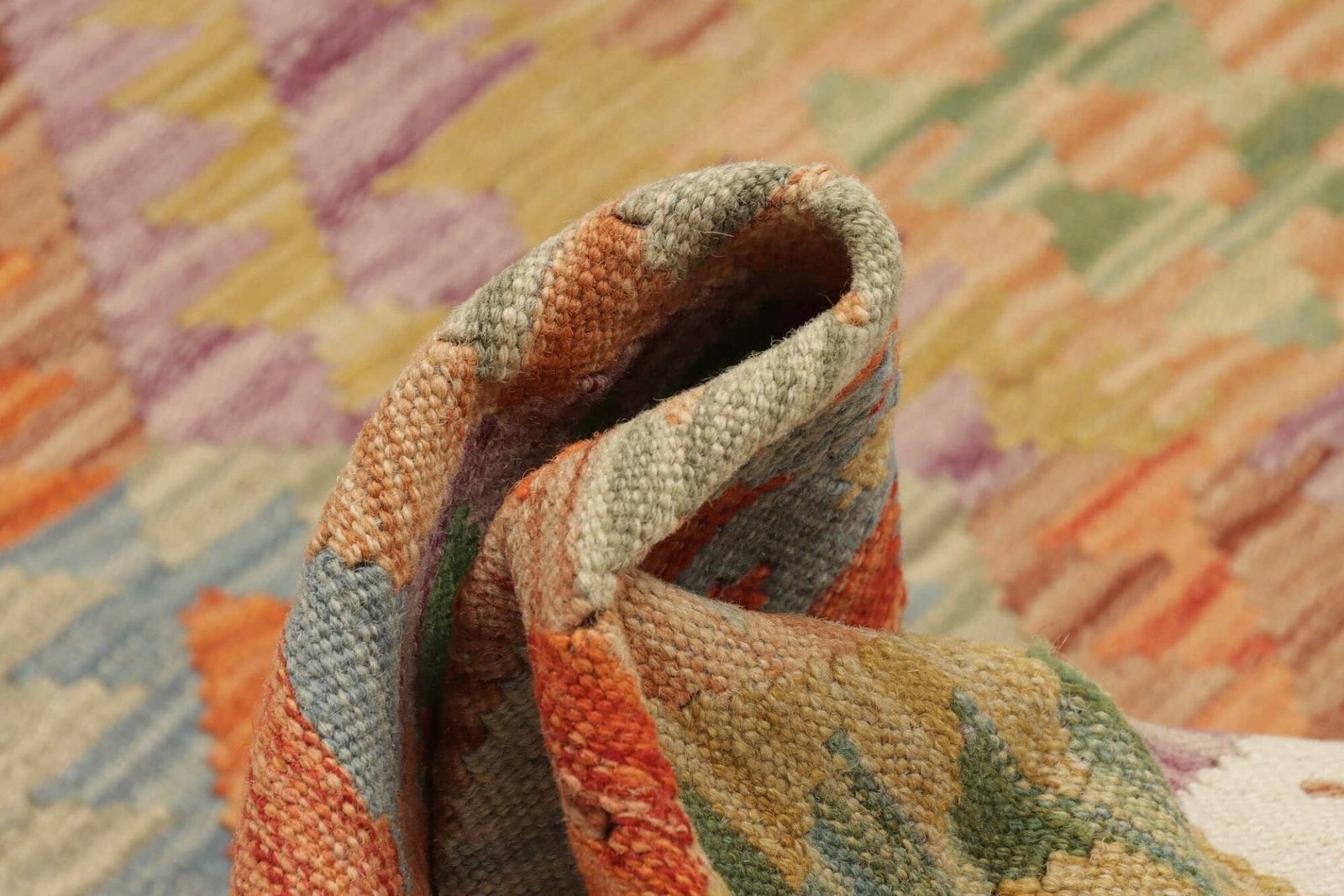 Der handgewebte Kelim besteht aus 100% Wolle und Baumwolle, was ihm nicht nur eine angenehme Haptik verleiht, sondern auch sorgt für Langlebigkeit und Robustheit. Wolle ist bekannt für ihre hervorragenden isolierenden Eigenschaften, während Baumwolle für ihre Atmungsaktivität und Pflegeleichtigkeit geschätzt wird. Diese Kombination macht den Teppich ideal für jeden Raum in Ihrem Zuhause, egal ob im Wohnzimmer, Schlafzimmer oder Flur.