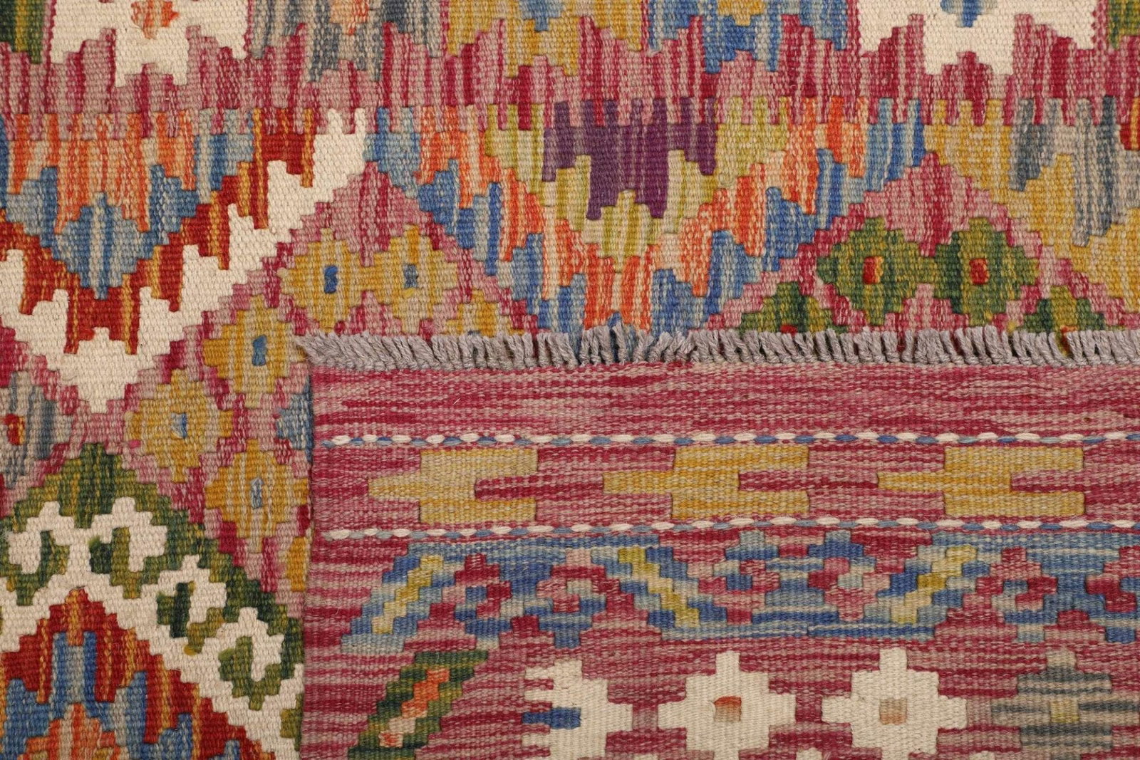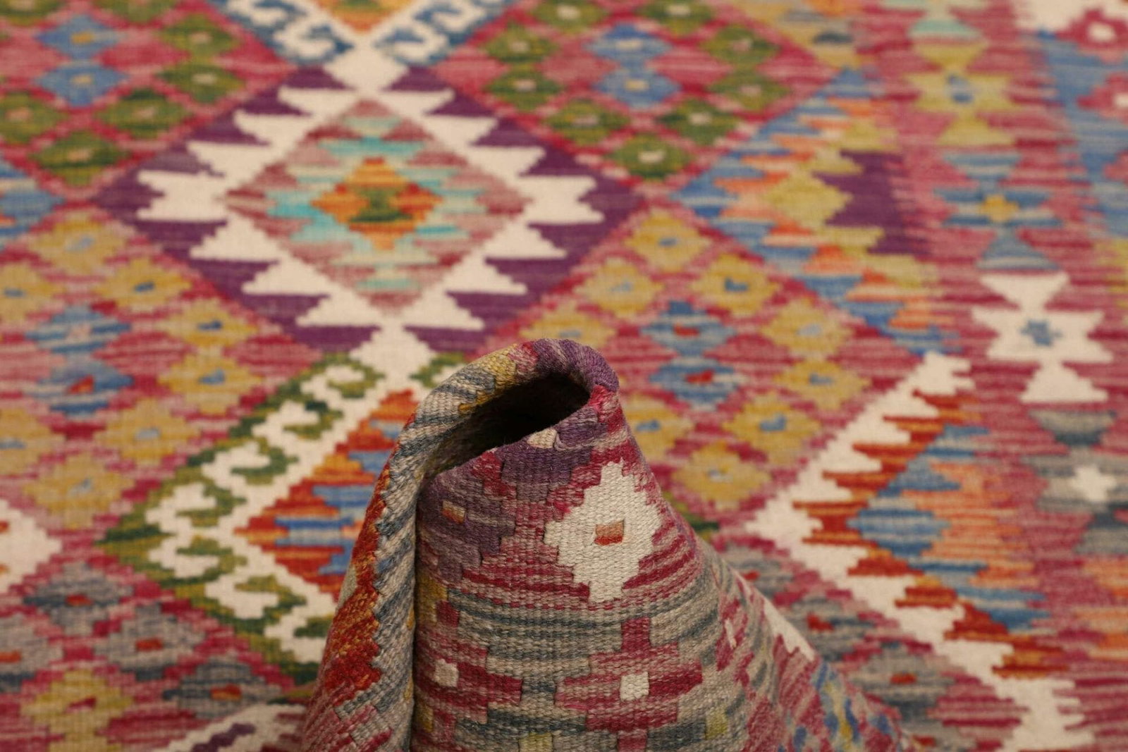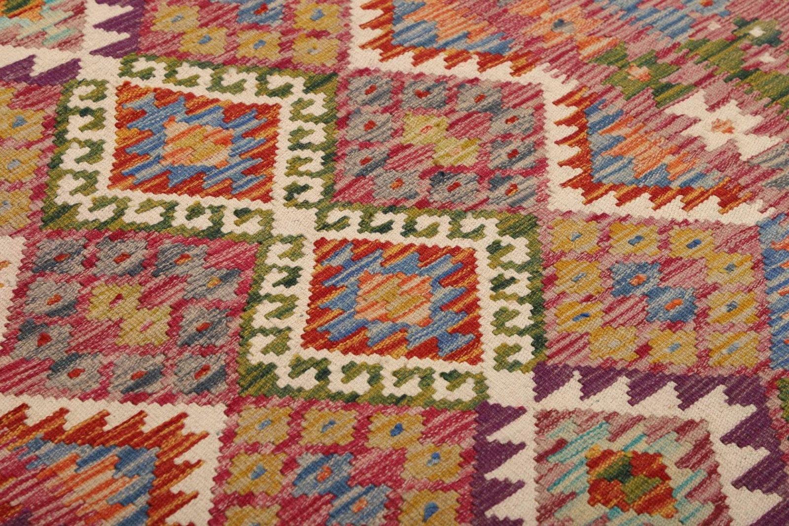 Die Richtlinien und Traditionen des Teppichwebens haben sich von Generation zu Generation weiterentwickelt, wobei die Kunst des Webens weiterhin eine wichtige Rolle in der Kultur der jeweiligen Region spielt. Dieser handgewebte Kelim ist nicht einfach nur ein Teppich, sondern ein Kunstwerk, das Geschichte und Tradition in Ihr Zuhause bringt.