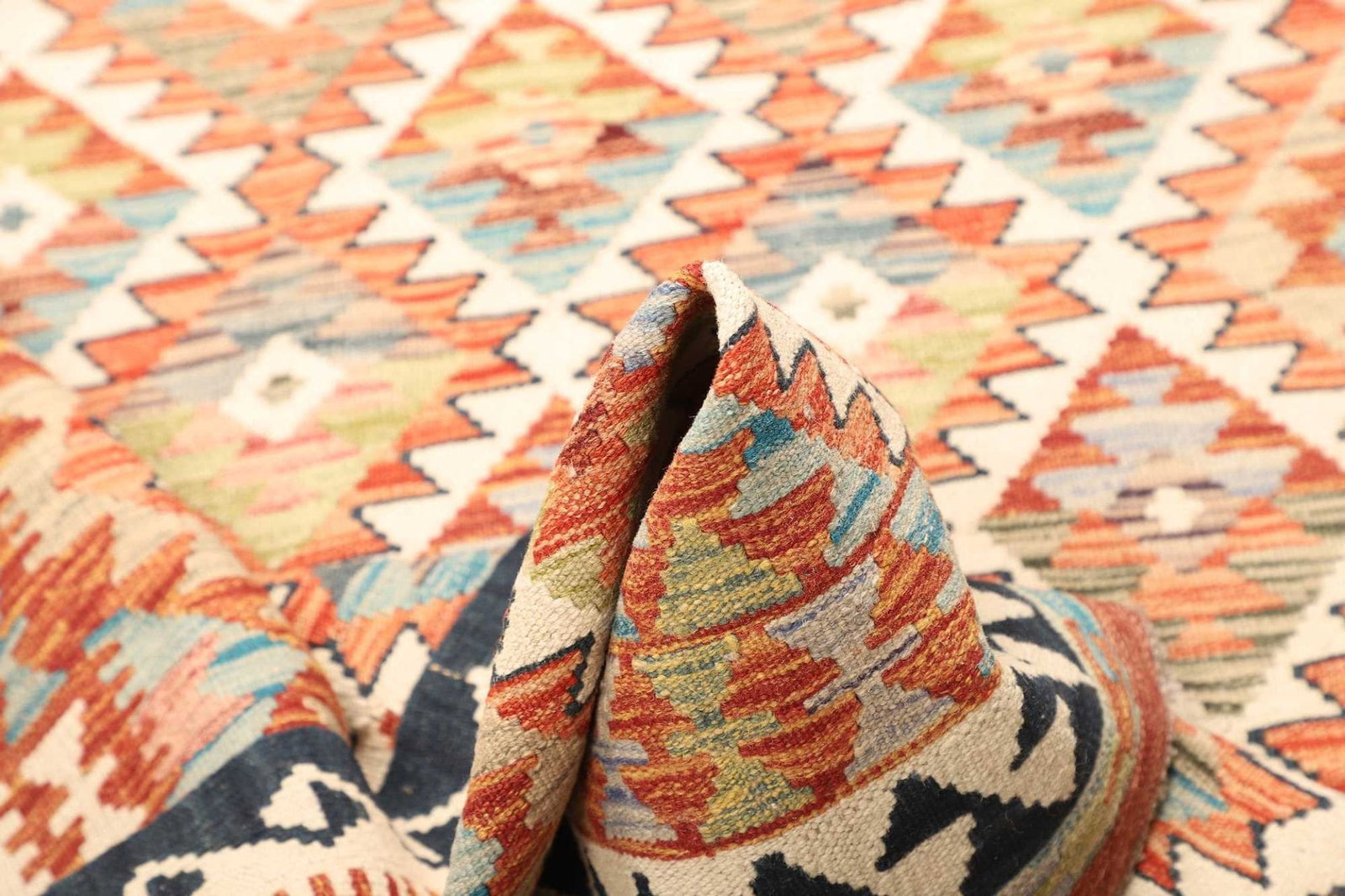 Ein weiterer Vorteil dieses handgewebten Kelims ist seine Pflegeleichtigkeit. Im Vergleich zu handgeknüpften Teppichen ist ein Kelim flach und hat keine hohen Fasern, was die Reinigung erleichtert. Zudem ist der Teppich robust genug, um in stark frequentierten Bereichen eingesetzt zu werden, ohne an Schönheit zu verlieren. Die Verwendung von natürlichen Materialien und die traditionelle Webtechnik garantieren nicht nur eine ansprechende Optik, sondern auch eine umweltfreundliche Wahl für Ihr Zuhause.