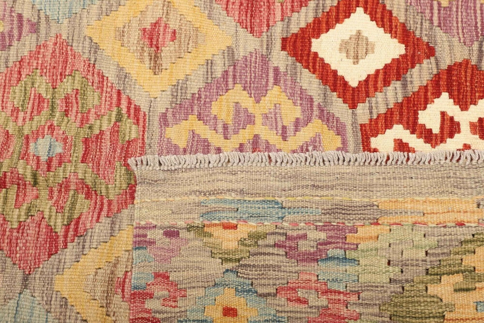 Der handgewebte Kelim präsentiert sich in rustikalen Farbtönen und Mustern, die an die klassischen Designs des Orients erinnern. Die geometrischen Formen und kräftigen Farben stellen eine harmonische Verbindung zu traditionellem Handwerk und zeitgemäßem Stil her. Diese Designs können sowohl modern als auch zeitlos wirken, sodass sie sich in verschiedenen Einrichtungsstilen integrieren lassen. Die Verwendung von natürlichen Wollen sorgt dafür, dass die Farben lebendig und beständig bleiben.