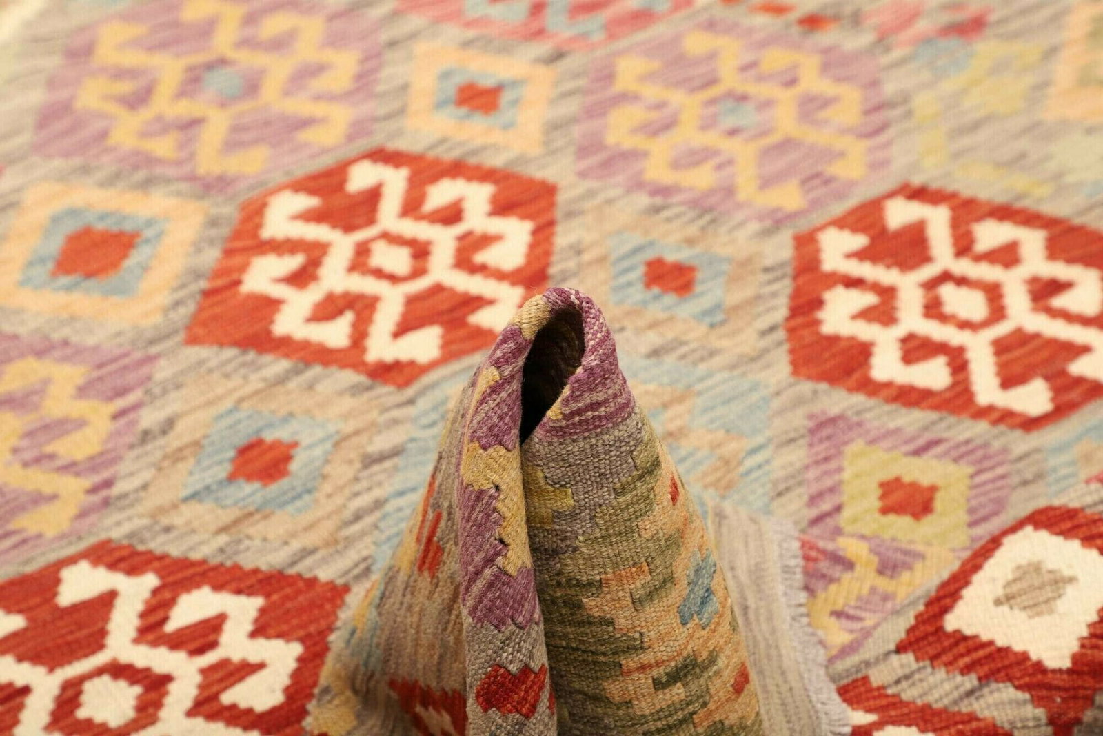 Die Wahl von Schurwolle als Material betont nicht nur die Qualität, sondern auch die Umweltfreundlichkeit dieses handgewebten Kelims. Jedes Muster und jede Farbe, die Sie auf diesem luxuriösen Stück entdecken, wird durch die traditionelle webtechnische Fertigung zu einem einzigartigen Kunstwerk. Die Herstellung des Teppichs erfolgt nach uralten Techniken, die über Generationen weitergegeben werden. Die Knotendichte trägt entscheidend zu seiner Stabilität und Haltbarkeit bei und macht ihn zu einem wertvollen Erbstück für zukünftige Generationen.