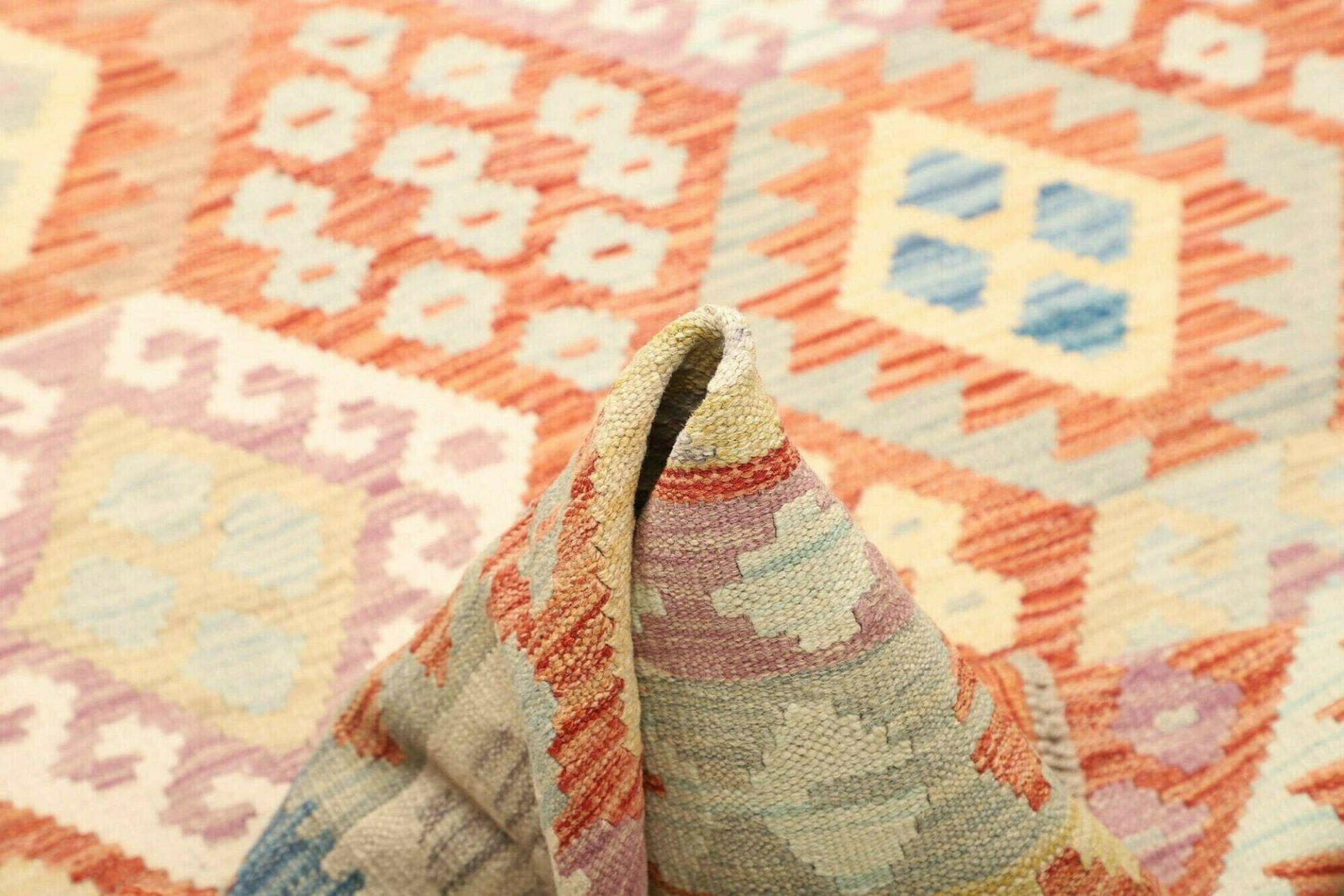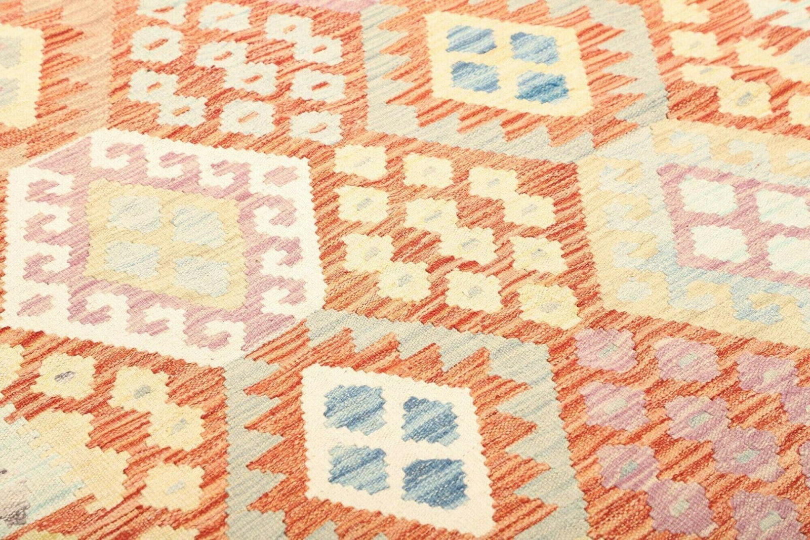 Ein weiterer herausragender Aspekt dieses handgewebten Kelims ist die Knotendichte, die darauf hinweist, dass er mit viel Sorgfalt und Präzision gefertigt wurde. Oftmals wird gesagt, je höher die Knotendichte, desto langlebiger der Teppich. Der Kelim ist ein vielseitiges Schmuckstück, das sowohl in modernen als auch in klassischen Interior-Stilen zur Geltung kommt. Seine Pflegeleichtigkeit, robusten Eigenschaften und zeitloses Design machen ihn zu einer wertvollen Investition für jedes Zuhause.