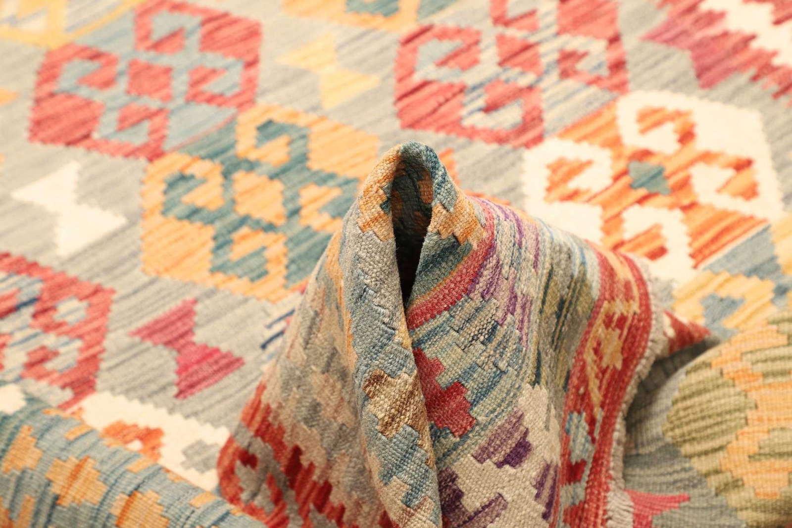 Die Designs des handgewebten Kelims sind sowohl zeitlos als auch modern und sind in verschiedenen Farben und Mustern erhältlich. Die geometrischen Motive vermitteln ein Gefühl von Ordnung und Harmonie und tragen zur rustikalen Ästhetik bei. Dieser Teppich ist vielseitig einsetzbar und ergänzt sowohl klassische als auch moderne Einrichtungsstile.