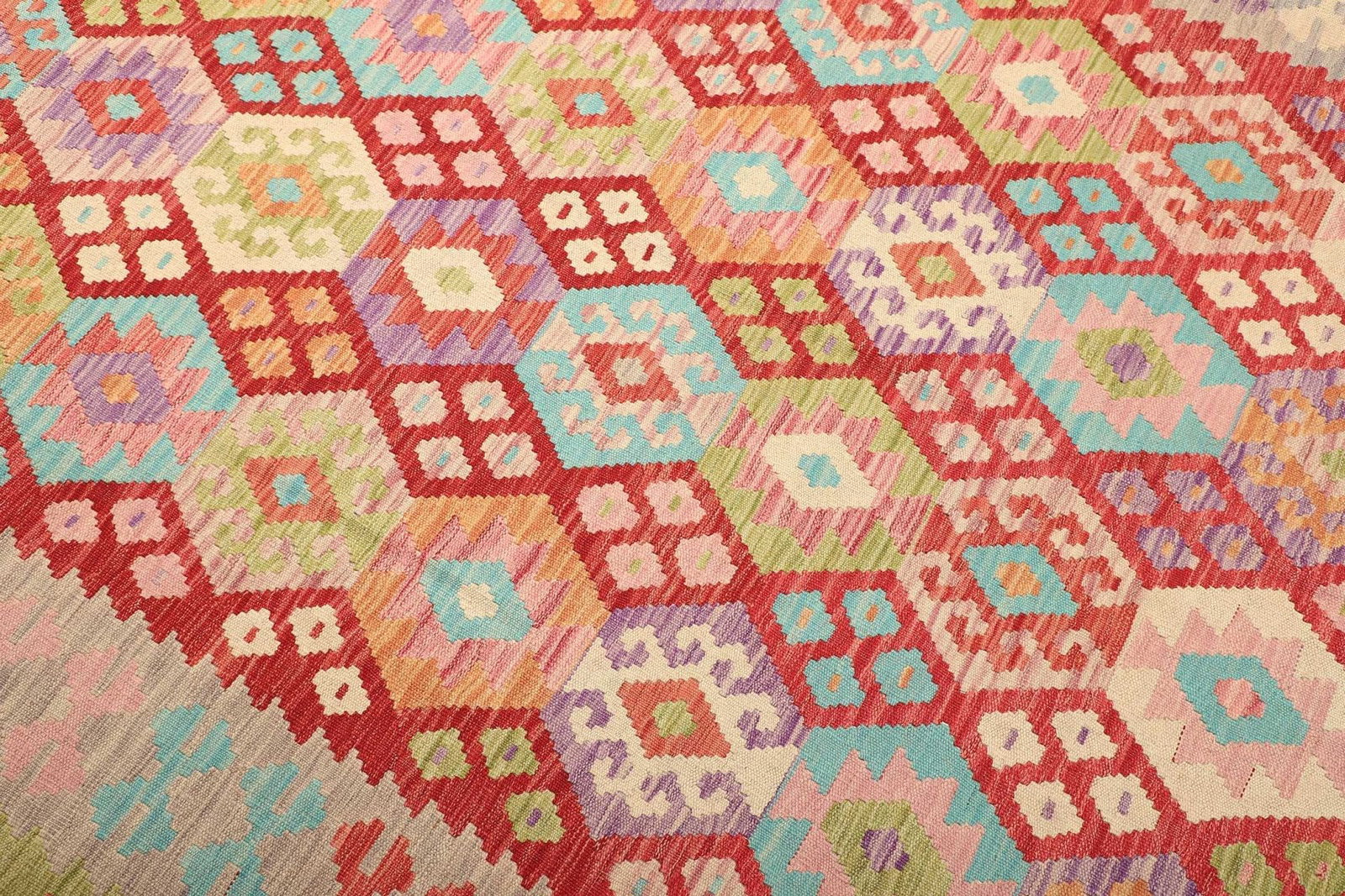 Der Kelim ist aus reiner Schurwolle hergestellt, die für ihre Langlebigkeit und Strapazierfähigkeit bekannt ist. Schurwolle besitzt von Natur aus schmutzabweisende Eigenschaften, wodurch der Teppich besonders pflegeleicht und robust ist. Das handgewebte Verfahren verleiht dem Teppich zudem eine hervorragende Knotendichte, die für die Stabilität und die Struktur des Gewebes sorgt. Da jeder Kelim in Handarbeit gefertigt wird, ist jedes Stück ein Unikat mit einer ganz eigenen Geschichte.