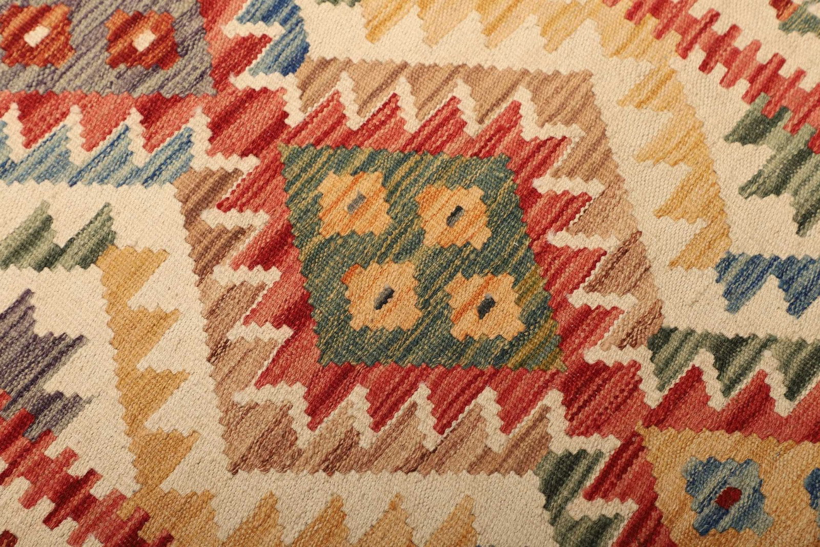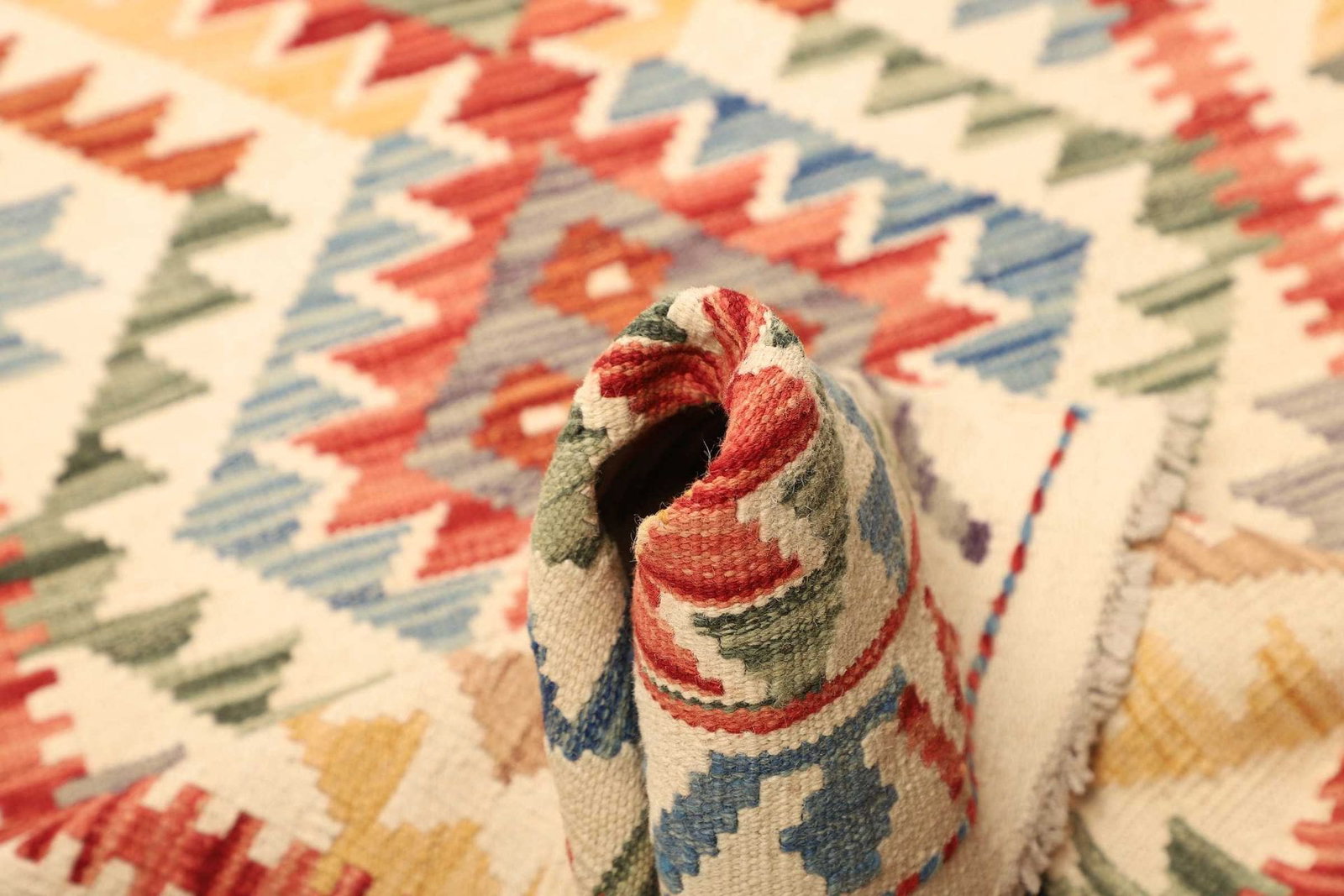 Der handgewebte Kelim besteht aus 100% Schurwolle, einem Material, das für seine Weichheit und Widerstandsfähigkeit bekannt ist. Schurwolle hat hervorragende isolierende Eigenschaften, hält warm im Winter und sorgt für angenehme Kühle im Sommer. Die Hochwertigkeit des Materials sorgt dafür, dass der Teppich nicht nur schön aussieht, sondern auch viele Jahre halten kann. Die handgewebte Technik verleiht dem Kelim zusätzlich eine einzigartige Struktur und Tiefe, die sich wunderbar anfühlt und sichtbar ist.