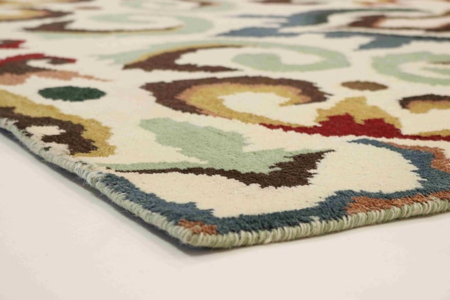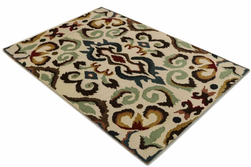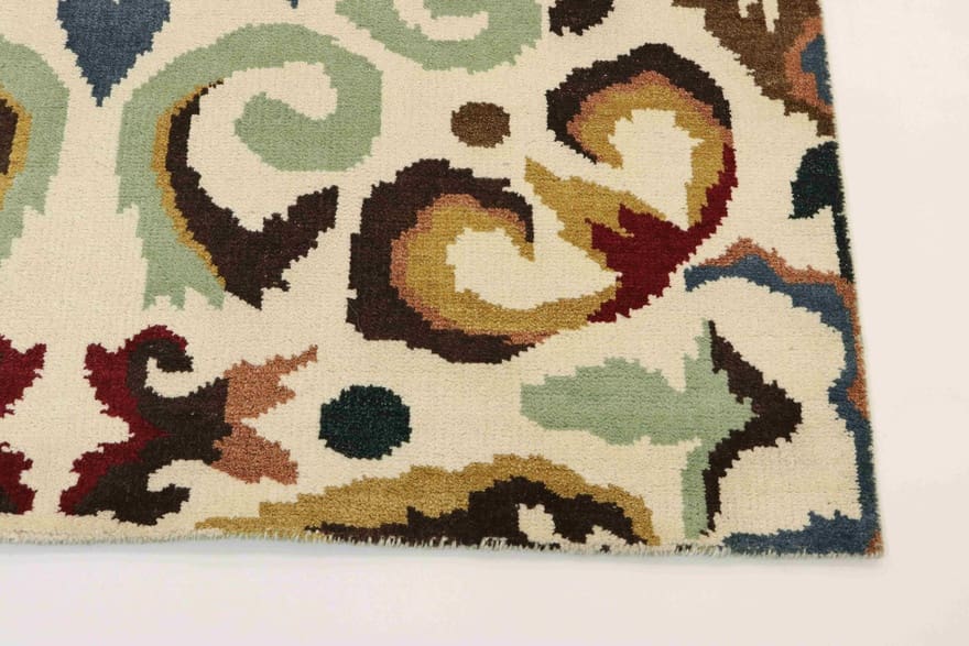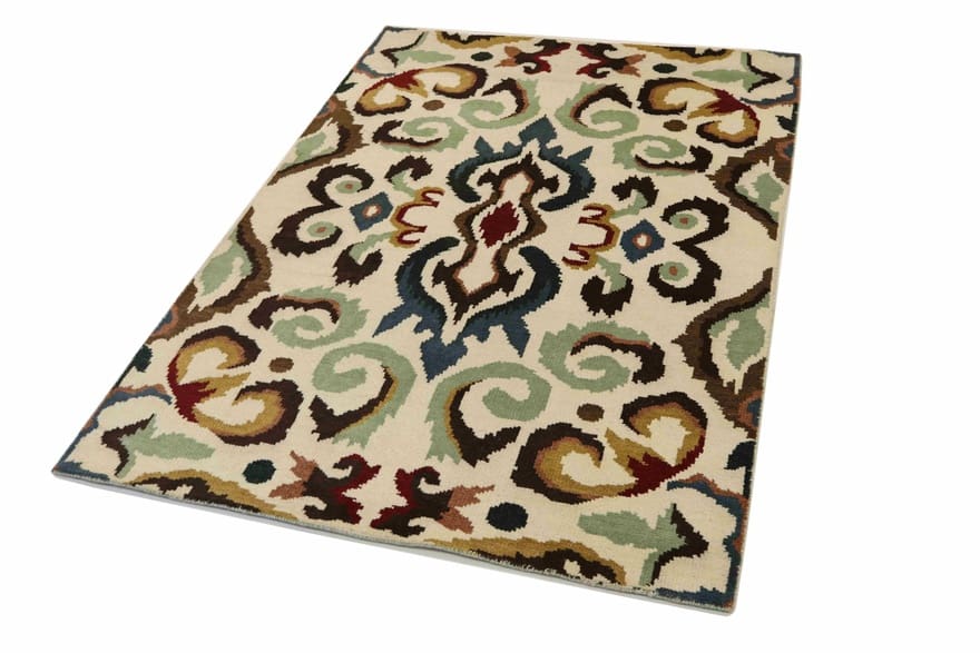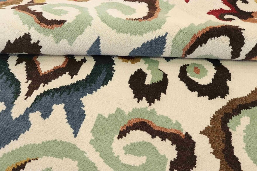 Handgewebter MODERN-IKAT Teppich | Knotendichte: 90.000 Knoten/m² | Material: Hochwertige Wolle und Baumwolle | Größe: 236×165 cm | Farbe: Creme, Grün, Ocker, Blau, Dunkelrot | Zustand: Neu | Ursprung: Indien | Verarbeitung: Handgeknüpft | Pflegeleicht und schmutzabweisend