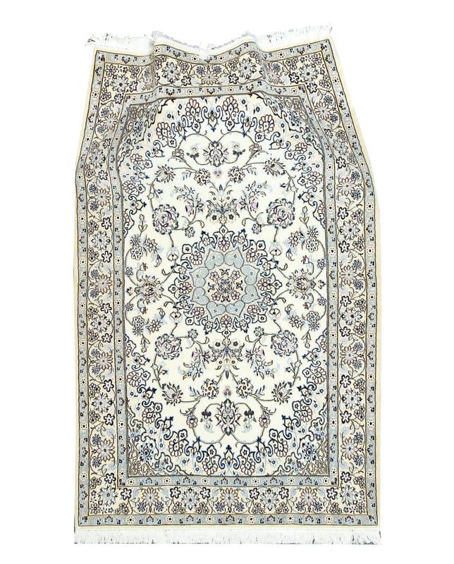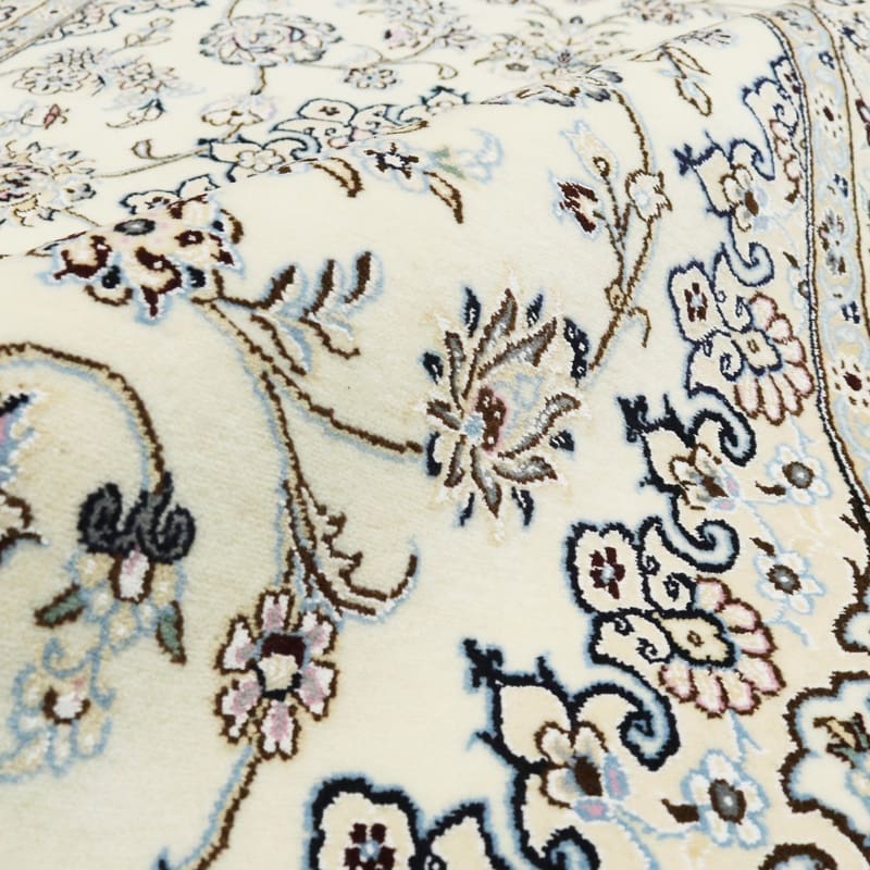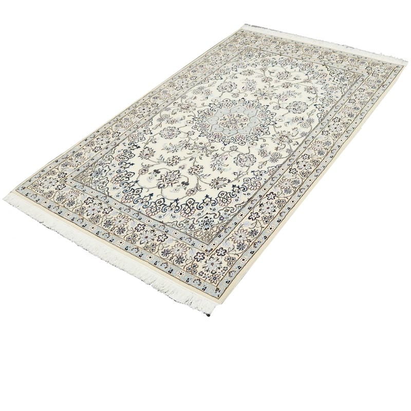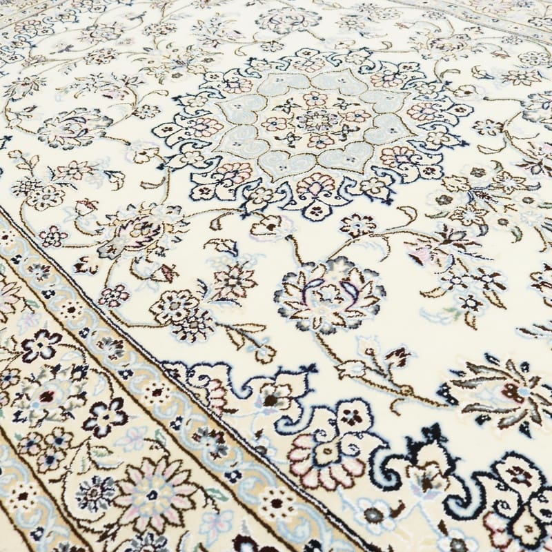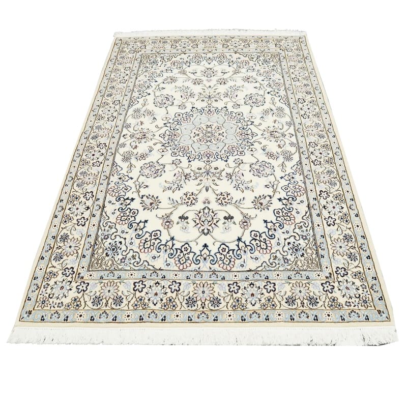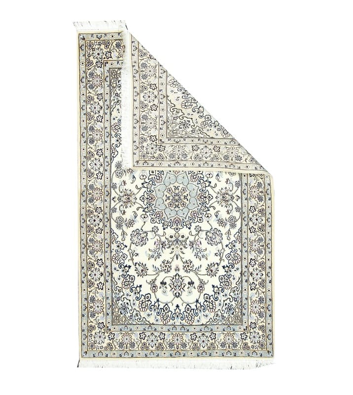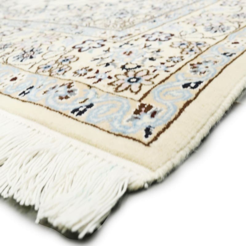 Handgewebter Nain 9 La Teppich | Knotendichte: 440.000 – 490.000 Knoten/m² | Material: Wolle/Seide | Größe: 216×129 cm | Farbe: Zarte Blau- und Cremetöne | Zustand: Neu | Ursprung: Iran/Persien | Form: Rechteckig | Gewicht: ca. 8 kg
