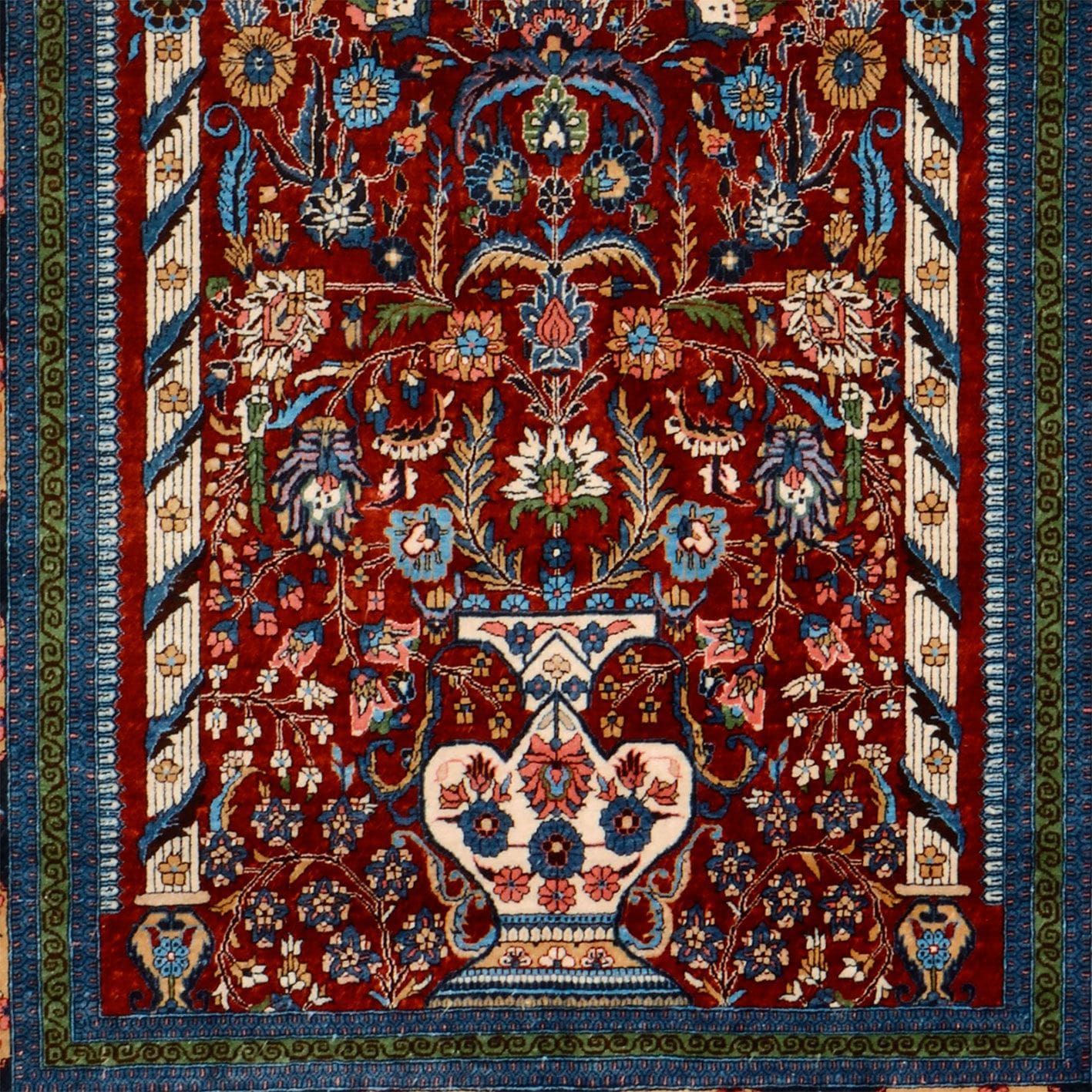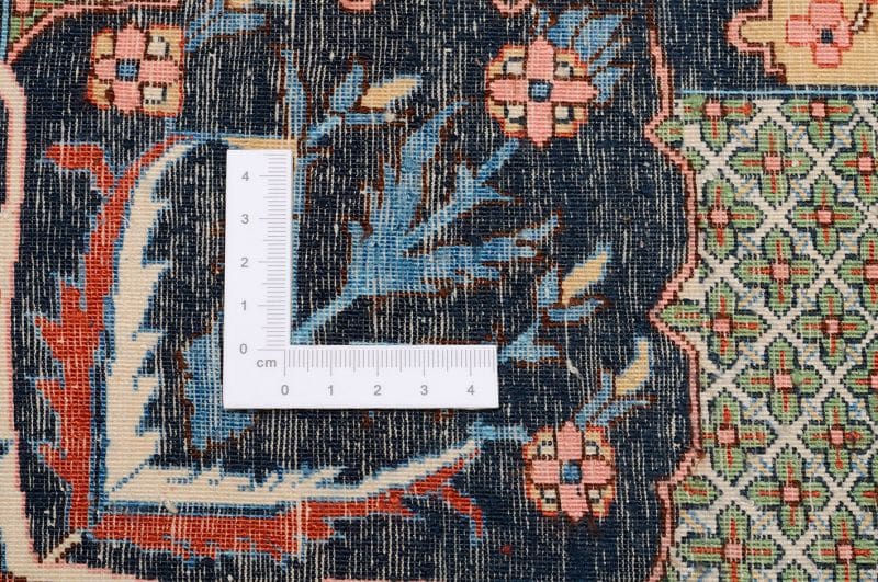 Ein besonderes Merkmal des Hereke Teppichs ist die ausgezeichnete Verarbeitungsqualität und die Verwendung von erlesenen Materialien. Jeder Teppich wird von erfahrenen Handwerkern liebevoll per Hand geknüpft, wobei die Knotenzahl pro Quadratmeter in der Regel sehr hoch ist. Dies führt zu einer klaren und präzisen Darstellung der Muster, die auch bei näherem Hinsehen weiterhin beeindruckend bleibt. Zusätzlich steigert die Verwendung von Seide die Eleganz und den Glanz des Teppichs und macht ihn zu einem großartigen Blickfang in jedem Raum.