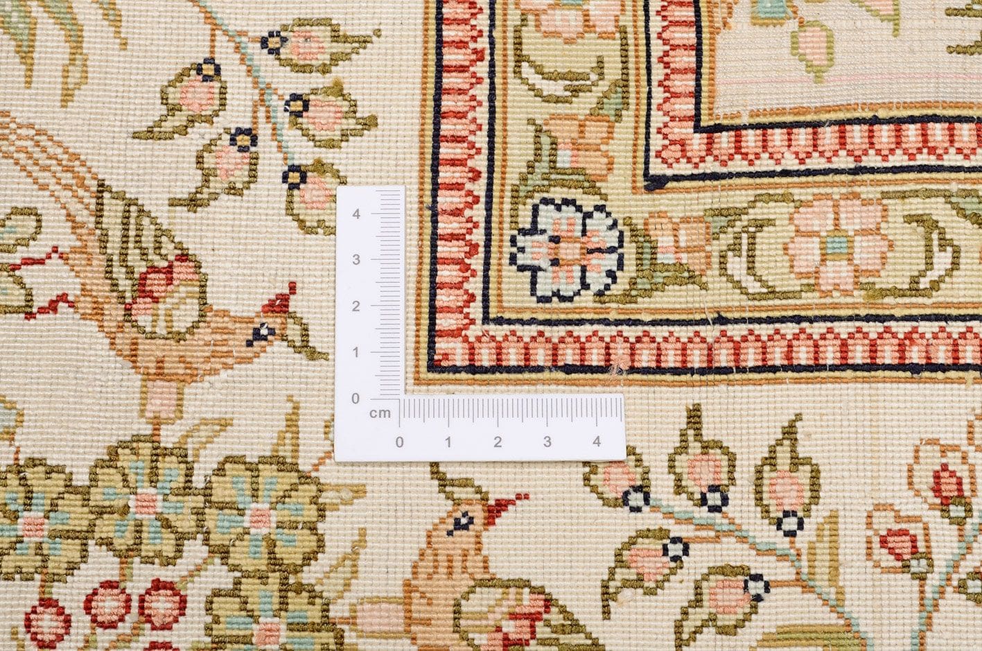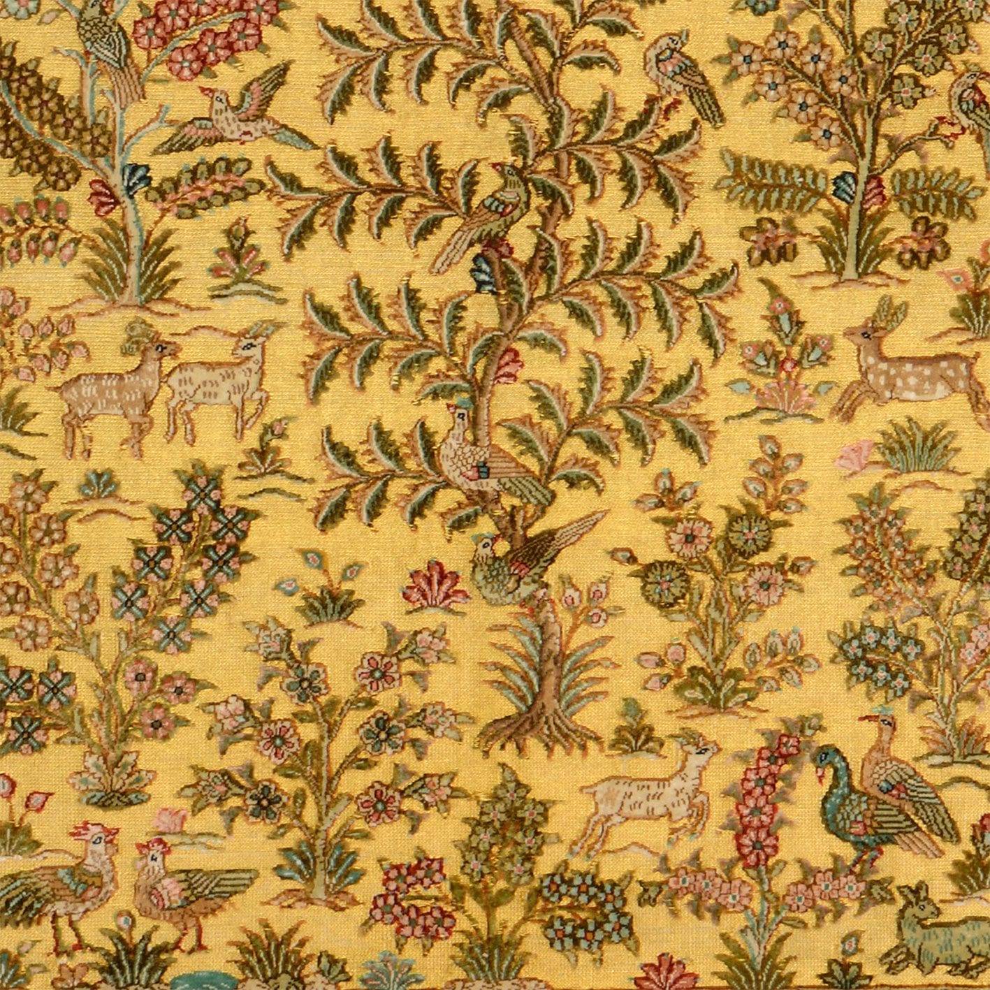 Der Hereke Teppich wird aus feinstem Seidenmaterial gefertigt, das nicht nur für seine Schönheit, sondern auch für seine Langlebigkeit bekannt ist. Seide ist ein edles Naturmaterial, das dem Teppich einen einzigartigen Glanz verleiht und die Farben lebendiger erscheinen lässt. Dieser handgeknüpfte Teppich verfügt über eine hohe Knotendichte, was bedeutet, dass er nicht nur robust ist, sondern auch extrem detailreiche Muster und Motive permiteert. Es ist bekannt, dass Teppiche aus Hereke eine Knotendichte von bis zu 1.000.000 Knoten pro Quadratmeter erreichen können, was die Kunstfertigkeit und den hohen Herstellungspreis widerspiegelt.