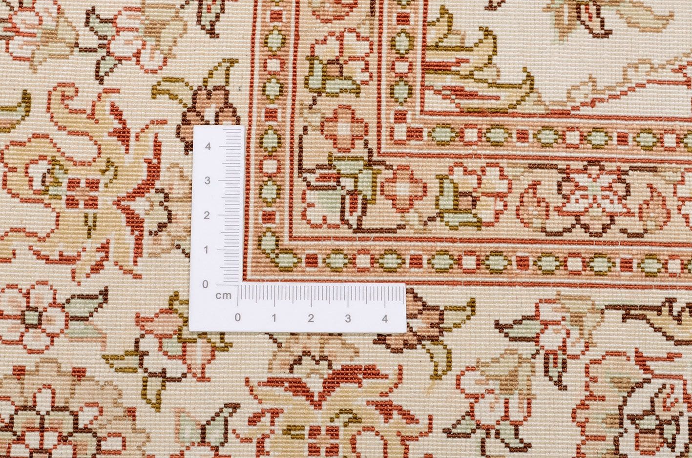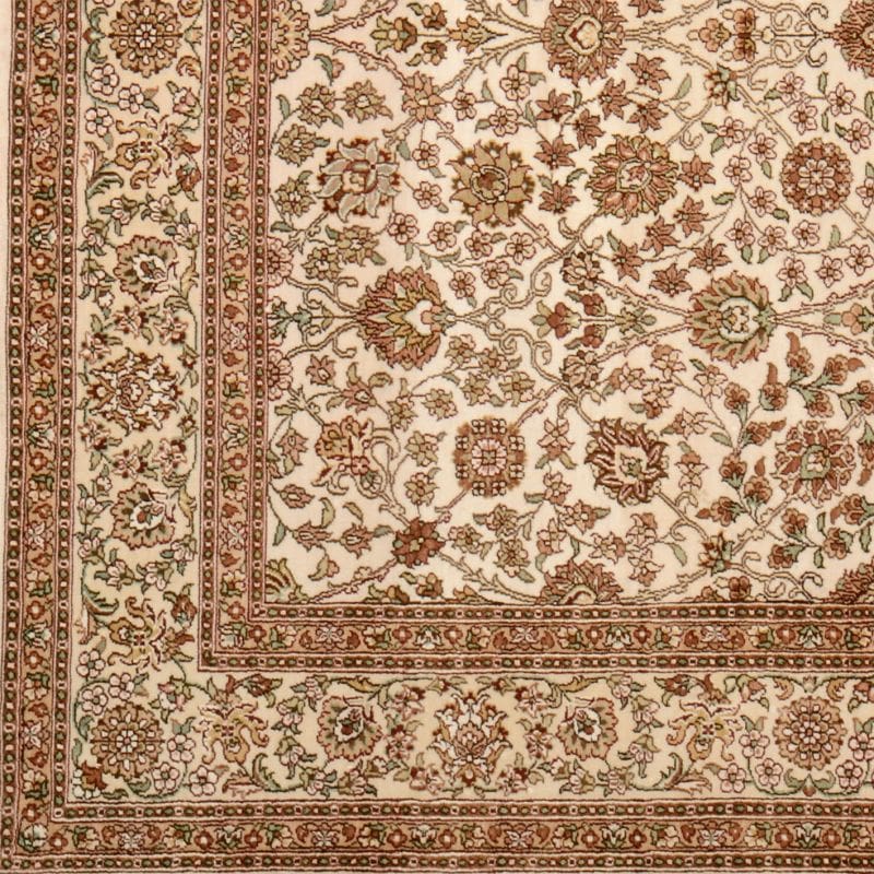 Ein herausragendes Merkmal dieses handgeknüpften Seidenteppichs ist seine zeitlose Schönheit, die auch nach Jahren noch begeistert. Er ist nicht nur ein dekoratives Element, sondern auch eine Investition in Kunst und Handwerk, die die kulturellen Traditionen der Teppichherstellung bewahrt.
