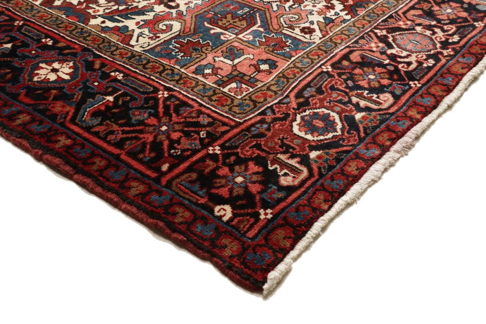 Das Design des Heriz Orientteppichs ist ein markantes Beispiel für die typischen geometrischen und floralen Muster, die für Teppiche aus dieser Region charakteristisch sind. Die kräftigen Farben, die in verschiedenen Nuancen von Rot, Blau, Gold und Grüntönen erscheinen, verleihen dem Teppich eine Dynamik und Lebendigkeit, die in jedem Raum zum Blickfang wird.