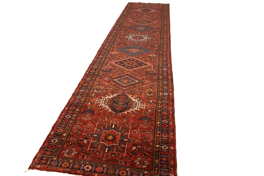 Antiker Heriz Teppich | Knotendichte: 128.000 – 160.000 Knoten/m² | Material: Wolle und Seide | Größe: 432×101 cm | Farbe: Rot/Orange | Zustand: Antik | Herkunft: Iran/Persien | Verarbeitung: Handgeknüpft | Dicke: ca. 8 mm | Gewicht: ca. 10 kg