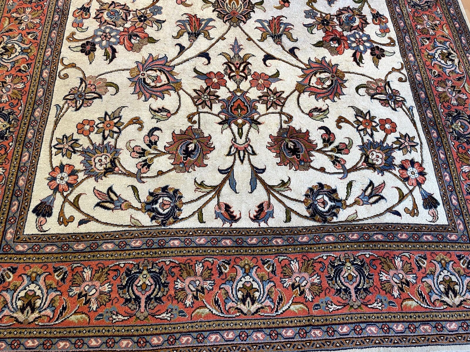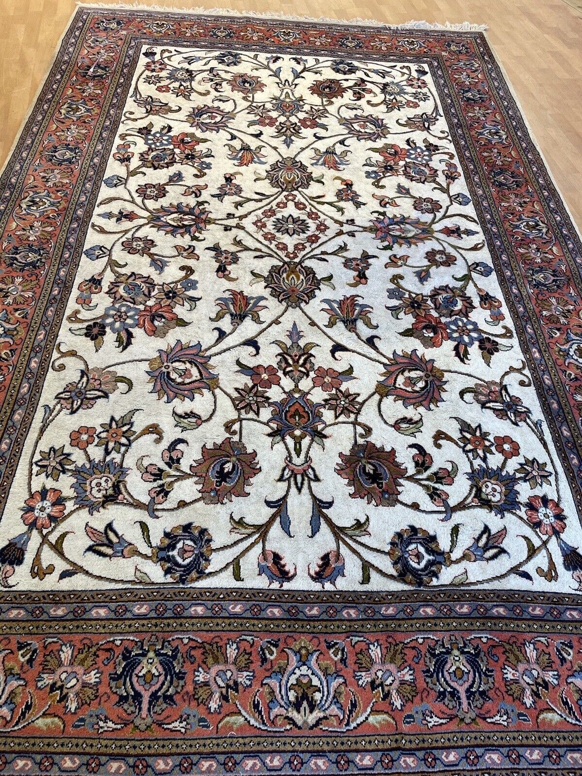 Die durchgängigen floralen Elemente des Sarough Teppichs zeichnen sich durch ihre Eleganz und Vielfältigkeit aus. Die geschwungenen Linien und das harmonische Farbspiel machen ihn zu einem perfekten Ergänzungsstück in verschiedenen Einrichtungsstilen – von klassisch bis modern. Die helle Grundfarbe bringt eine gewisse Leichtigkeit mit sich, während die rote Bordüre als dramatisches Element fungiert, das den Teppich besonders hervorhebt.