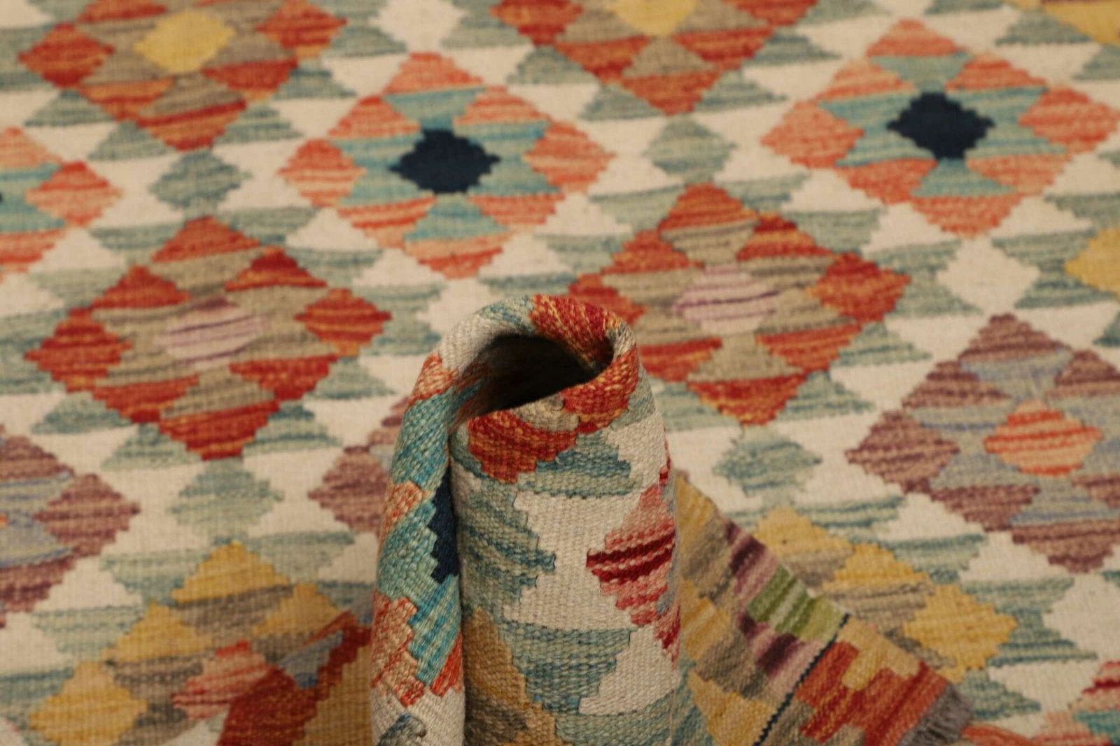 Ein herausragendes Merkmal dieses Kelims ist seine Vielseitigkeit. Er eignet sich sowohl für moderne als auch für traditionelle Wohnräume und setzt überall stilvolle Akzente. Dank der handgewebten Technik und der Verwendung natürlicher Materialien ist der Teppich nicht nur ästhetisch ansprechend, sondern auch umweltfreundlich. Darüber hinaus sorgt die Schurwolle dafür, dass der Teppich in jedem Raum eine warme und gemütliche Atmosphäre schafft.