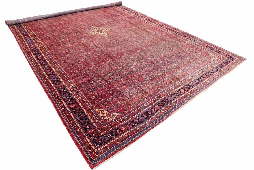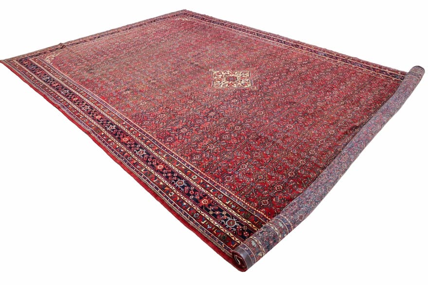 Handgeknüpfter HOSENABAD Teppich | Knotendichte: 200.000 – 250.000 Knoten/m² | Material: Wolle und Baumwolle | Größe: 532×345 cm | Farbe: Rot/Orange | Zustand: Antik | Ursprung: Iran/Persien | Dicke: ca. 8 mm | Gewicht: ca. 50 kg | Form: Rechteckig