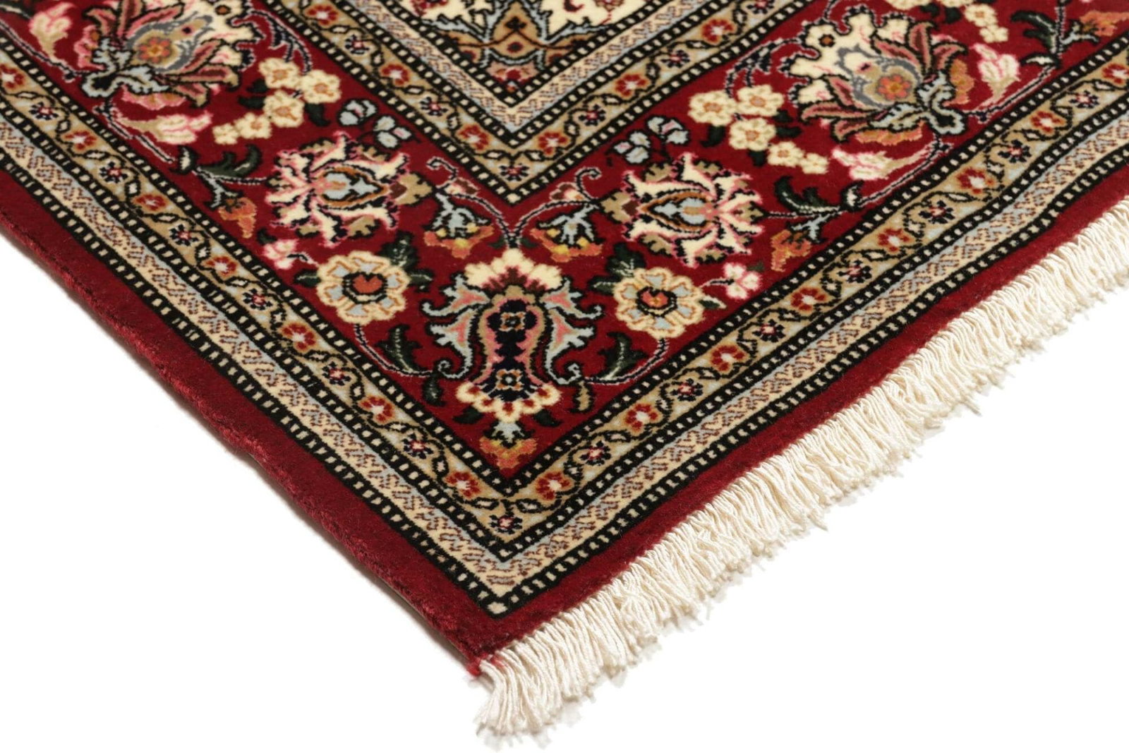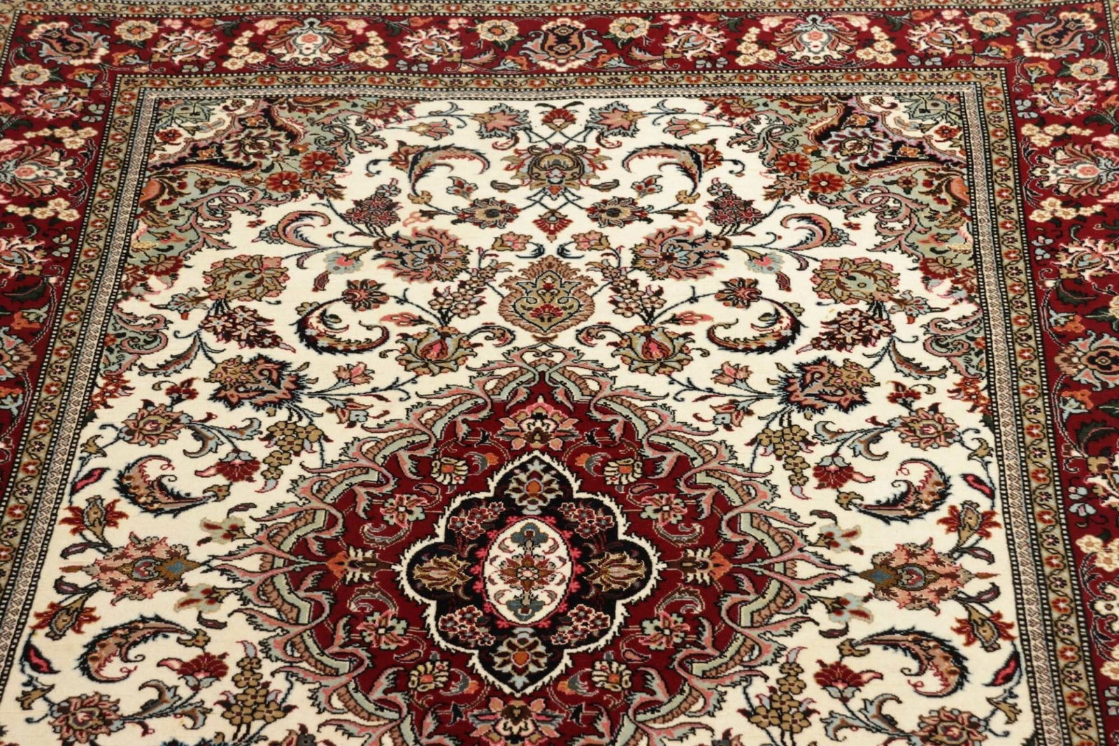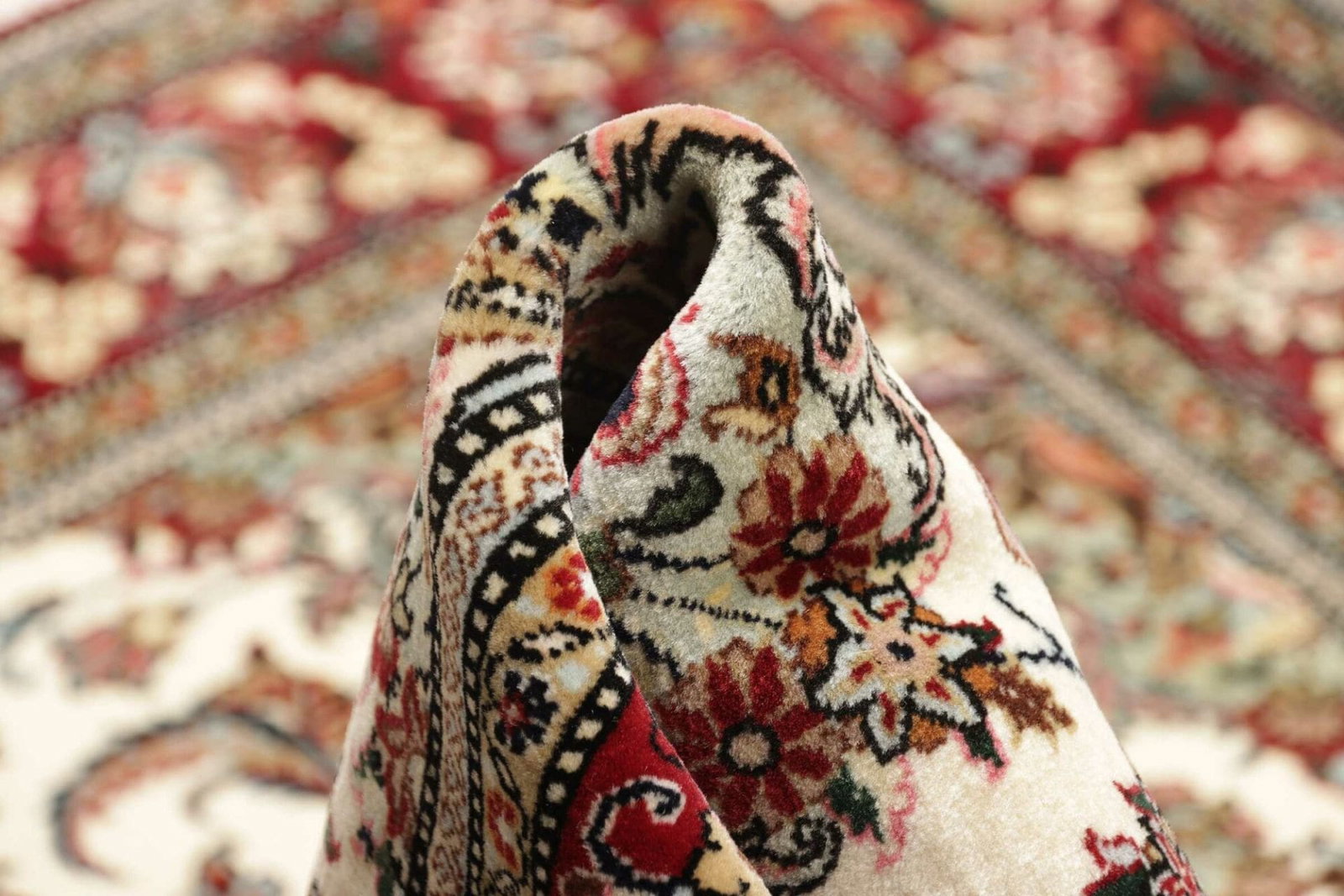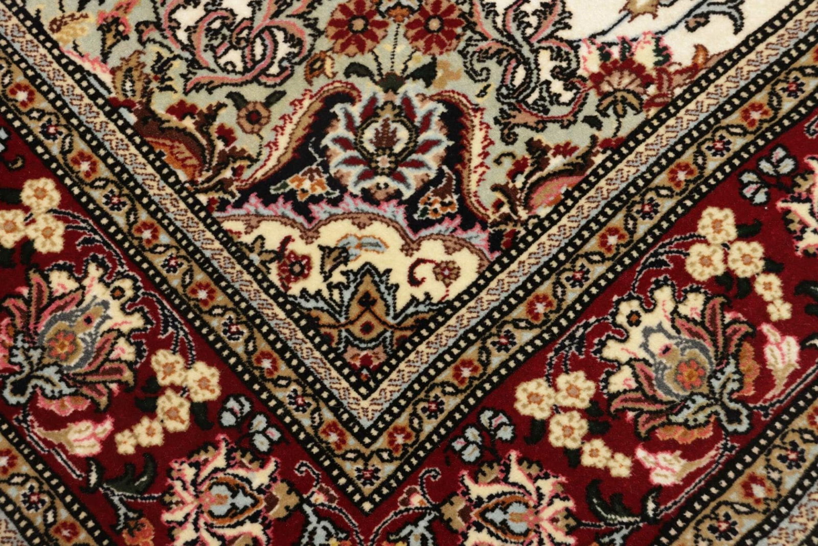 Der Teppich ist aus hochwertiger Wolle gefertigt, die für ihre Langlebigkeit und ihren weichen Griff bekannt ist. Wolle bietet nicht nur Robustheit, sondern auch eine natürliche Farbvielfalt, die in den vielen Details des Designs zur Geltung kommt. Die Kunst des Knüpfens wird traditionell von Hand ausgeführt, was jedem Stück eine einzigartige Note verleiht. Die Knotendichte von 600 Knoten sorgt dafür, dass das Muster sehr fein und detailliert ist, was die Qualität und den Wert des Teppichs unterstreicht.