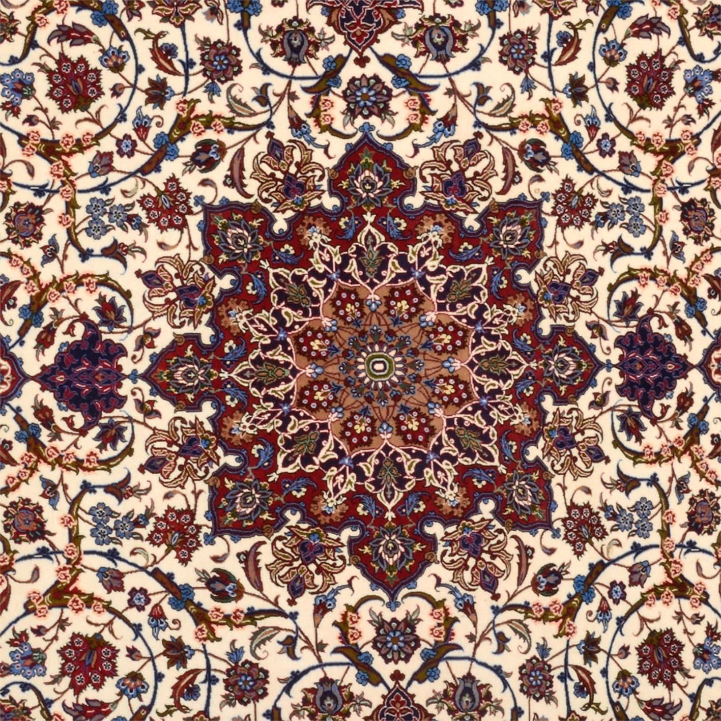 Der Isfahan Teppich zeichnet sich durch seine hohe Knotendichte von 1 Million Knoten sowie durch seine floralen Muster und die Verwendung hochwertiger Materialien aus. Jeder Teppich wird handgeknüpft, was ihm eine einzigartige Qualität und Langlebigkeit verleiht. Seine Designs und die sorgfältige Verarbeitung machen ihn zu einem zeitlosen Kunstwerk.