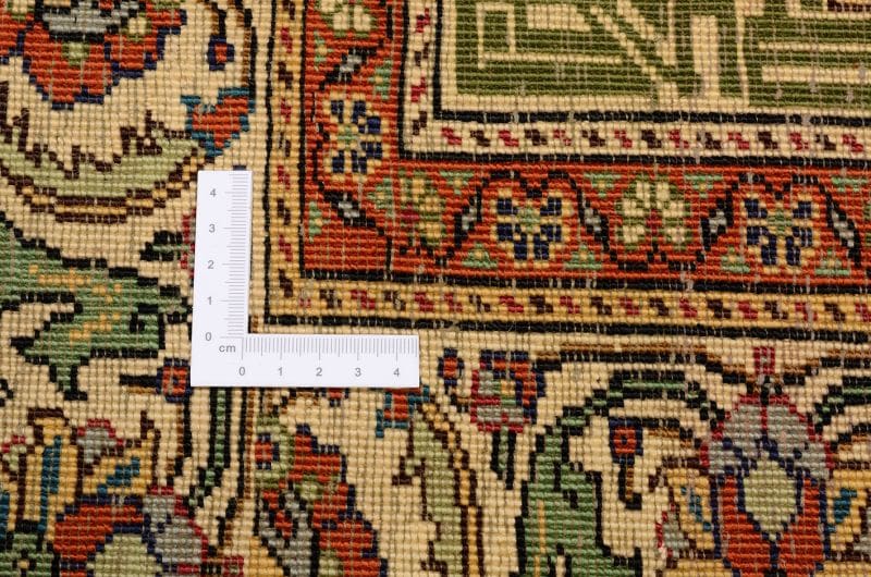 Der Kaiseri Orientteppich wird aus hochwertiger Seide gefertigt, die für ihre Haltbarkeit und ihren Glanz bekannt ist. Seide ist ein edles Material, das nicht nur optisch beeindruckt, sondern auch eine angenehme Haptik bietet. Die handgeknüpfte Technik garantiert, dass jeder Teppich ein Unikat ist, das mit viel Geduld und handwerklichem Geschick hergestellt wurde. Die Knotendichte dieses Teppichs ist außergewöhnlich hoch, was nicht nur die Qualität des Teppichs erhöht, sondern auch die Langlebigkeit und Stabilität sichert.