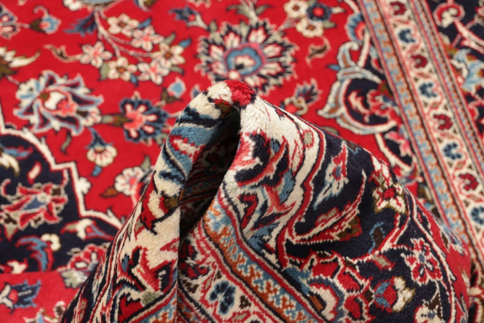 Dieser Kashan Teppich zeigt ein prächtiges, harmonisches Design, das traditionelle persische Muster mit einer modernen Eleganz verbindet. Die Farben sind sorgfältig aufeinander abgestimmt – warme Rottöne vereinen sich mit sanften Blautönen und erdigen Beigetönen, was eine beruhigende Atmosphäre in jedem Raum schafft. Die floralen Motive sind nicht nur ästhetisch ansprechend, sondern symbolisieren auch Wachstum, Leben und die unsterbliche Schönheit der Natur. Die kunstvollen Muster sind ein Ausdruck der kulturellen Identität und des künstlerischen Erbes der Region.