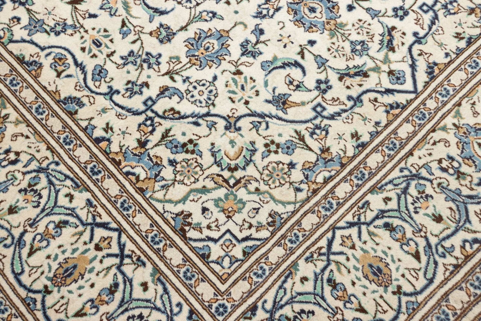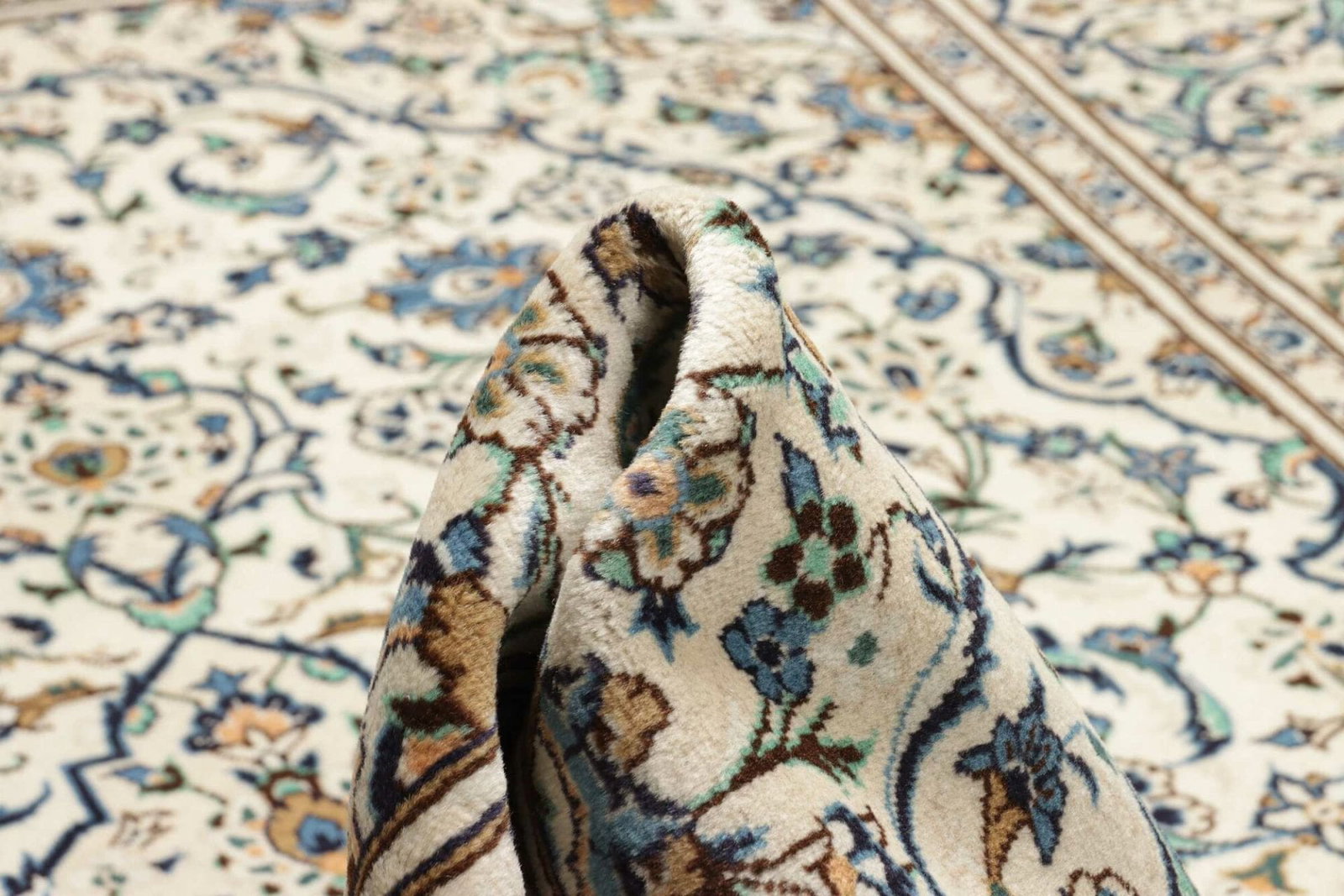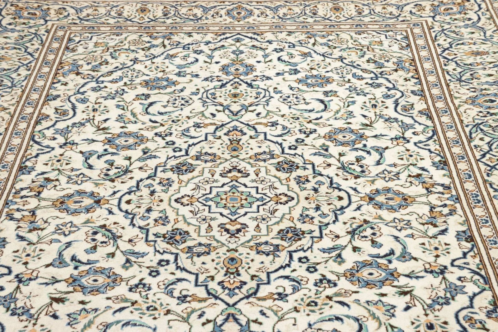 Der Einsatz von Schurwolle ist ein zentrales Element für die Qualität dieses Kashan Teppichs. Schurwolle hat von Natur aus Schmutz abweisende Eigenschaften und ist gleichzeitig atmungsaktiv, was zur Langlebigkeit des Teppichs beiträgt. Handgeknüpft mit einer hohen Knotendichte, garantiert dieser Teppich nicht nur eine wunderschöne Optik, sondern auch Widerstandsfähigkeit gegenüber alltäglichen Abnutzungen. Die hohe Knotendichte ist entscheidend, denn je höher die Knotenzahl pro Quadratmeter, desto filigraner und detailreicher sind die Designs, die der Teppich zeigt.