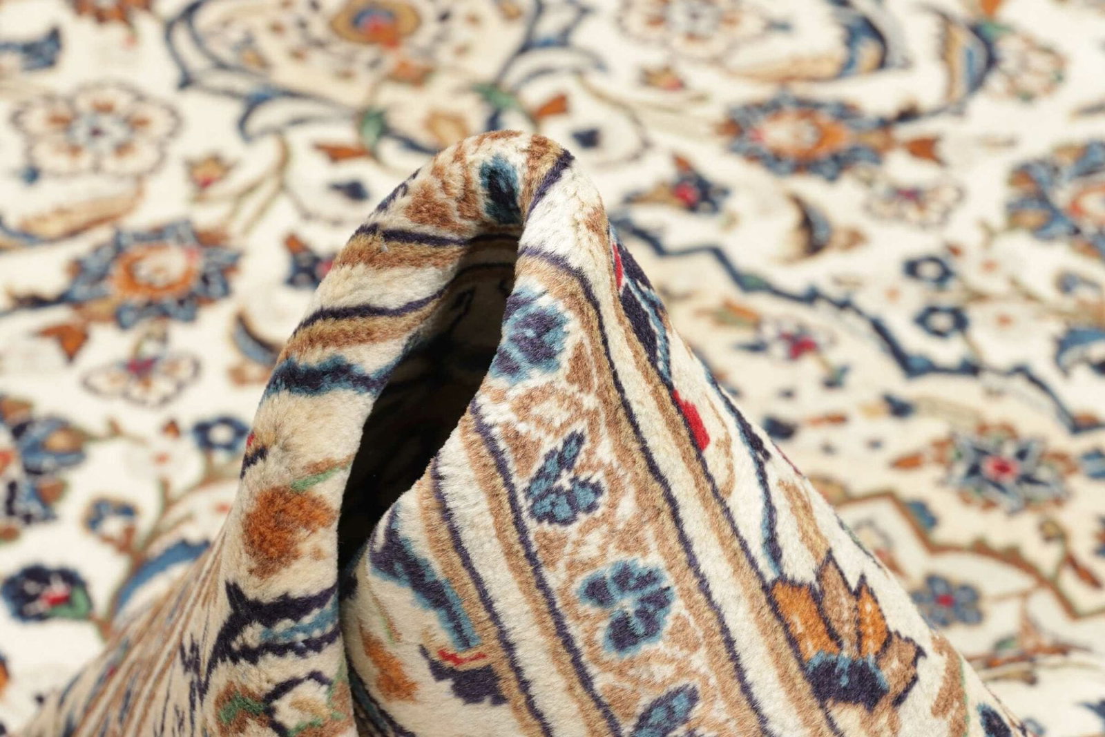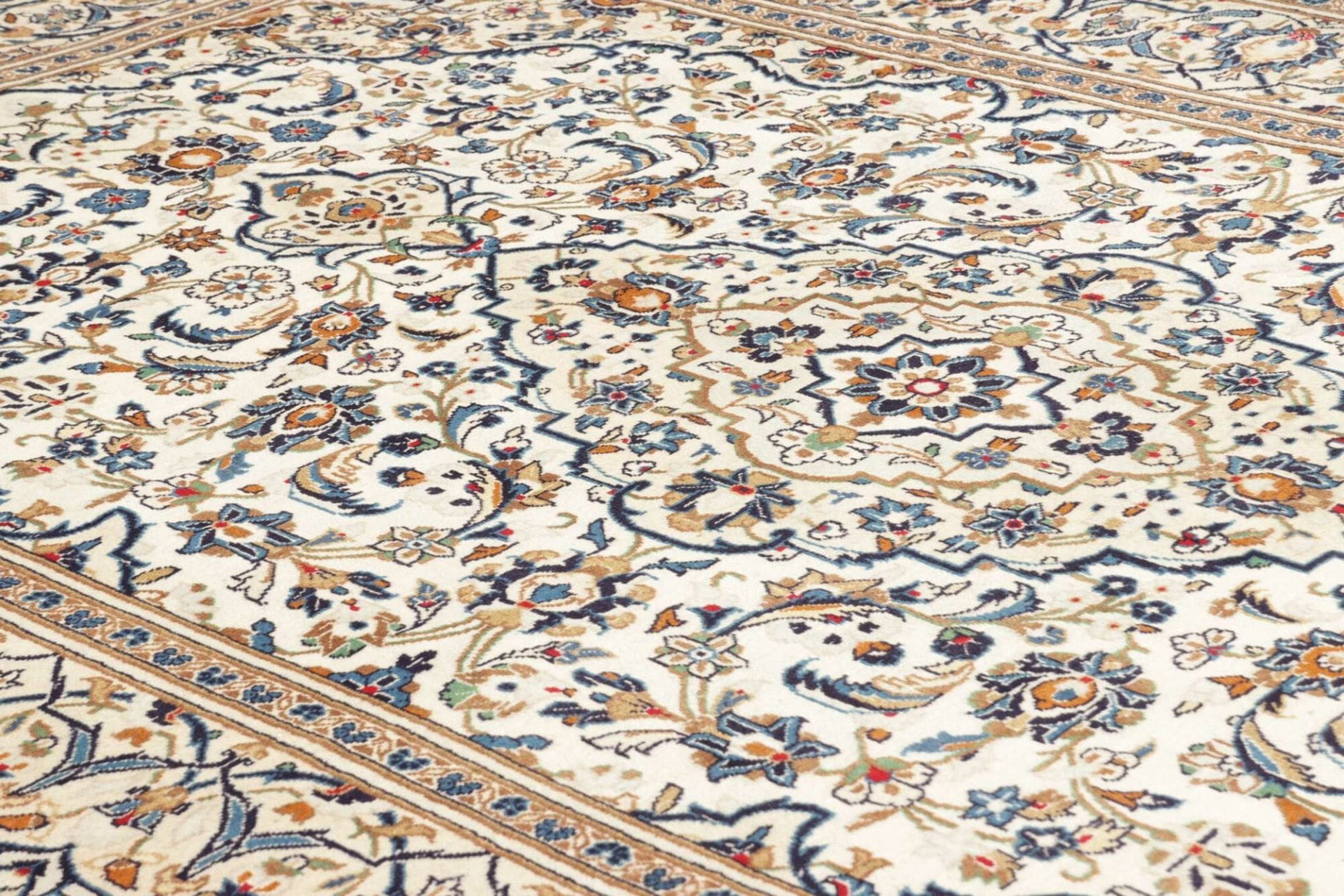Hergestellt aus hochwertigen Materialien, bietet der Kashan Teppich nicht nur eine ansprechende Optik, sondern auch eine hervorragende Langlebigkeit. Die Verwendung von reiner Wolle und Seide verleiht dem Teppich eine weiche Textur und einen angenehmen Griff. Durch die handknüpfende Technik, bei der jeder Knoten mit Präzision gesetzt wird, erreichen die Teppichmacher eine hohe Knotendichte, die für die Qualität und Langlebigkeit des Teppichs entscheidend ist. Dies sorgt dafür, dass der Teppich auch nach jahrelangem Gebrauch seine Schönheit behält und wenig Verschleiß zeigt.