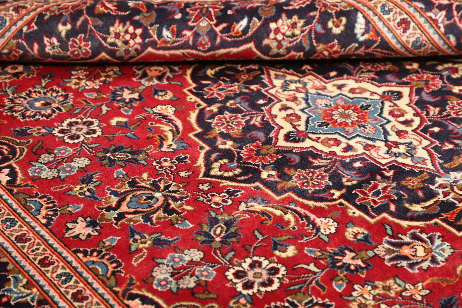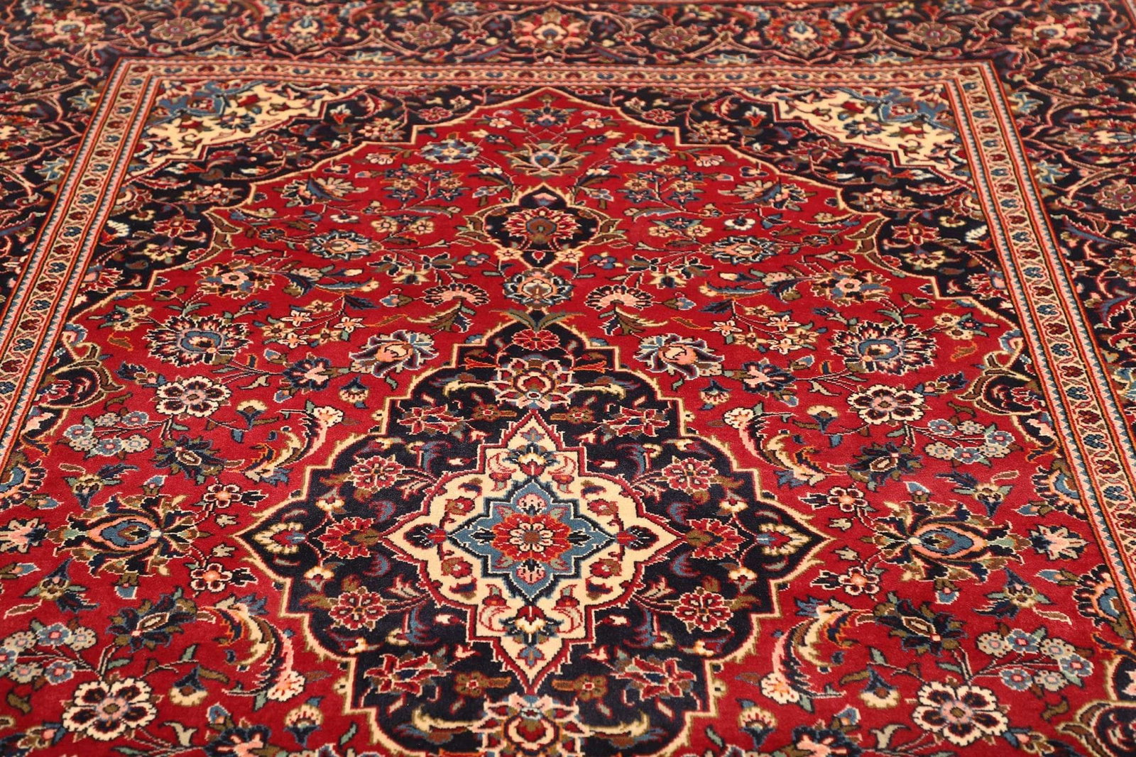 Kashan, die Stadt, aus der dieser Teppich stammt, liegt im Herzen Irans und ist berühmt für ihre Teppichproduktion, die eine lange Geschichte hat. Die Tradition des Teppichknüpfens in Kashan reicht bis ins 16. Jahrhundert zurück und ist tief verwurzelt in der Kultur und dem täglichen Leben der Menschen in dieser Region. Kashan-Teppiche sind bekannt für ihre feinen Designs und ihre harmonischen Farbkombinationen, die sowohl die Natur als auch die Kunst des Orients widerspiegeln. Die Herstellung von Kashan-Teppichen ist ein langwieriger Prozess, der viel Geschick, Erfahrung und geduldige Handarbeit erfordert.