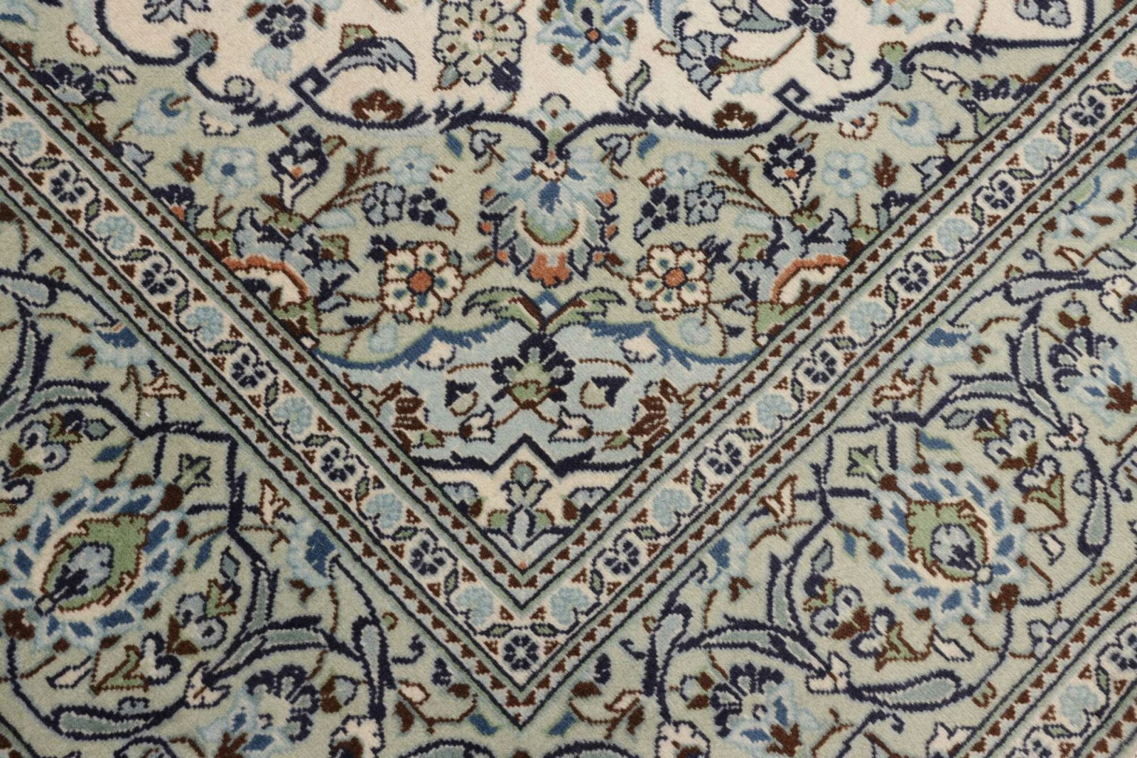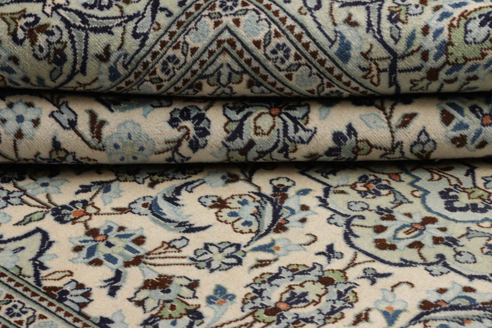 Eine der herausragenden Eigenschaften dieses Kashan Teppichs ist seine außergewöhnliche Knotendichte, die in der Regel zwischen 300.000 und 1.000.000 Knoten pro Quadratmeter liegt. Diese hohe Knotendichte ist ein Zeichen für die Präzision und Geduld, die in die Herstellung des Teppichs gesteckt wurden. Dadurch wird nicht nur die Haltbarkeit erhöht, sondern auch die Detailgenauigkeit der Muster kommt besonders zur Geltung.