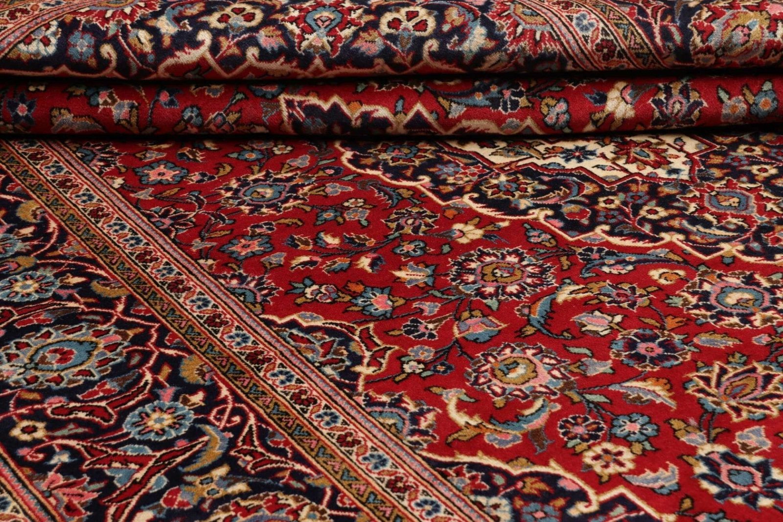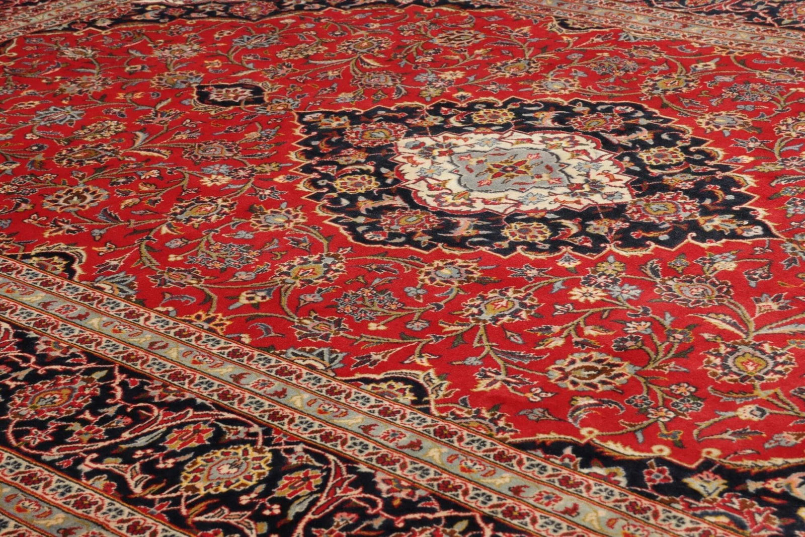 Ein besonderes Merkmal des Kashan Teppichs ist die hohe Knotendichte, die ihm eine außerordentliche Strapazierfähigkeit verleiht. Dieser Teppich ist nicht nur ein Kunstwerk, sondern auch eine praktische Bereicherung für jedes Zuhause, da er sowohl im Wohnbereich als auch in weniger frequentierten Räumen eindrucksvoll zur Geltung kommt. Die Pflegeleichtigkeit der Wolle sorgt dafür, dass der Teppich über Jahre hinweg seinen Glanz und seine prachtvollen Farben behält.