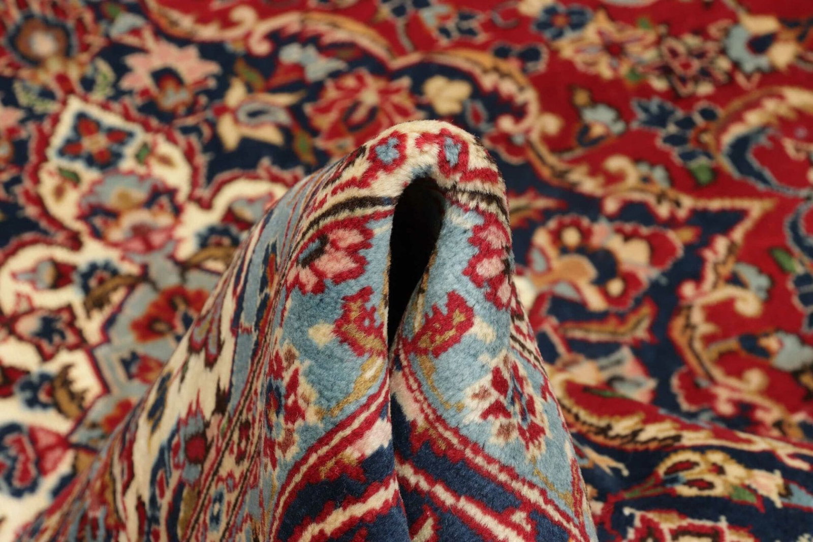 Die Farben in diesem Teppich reichen von tiefen Rottönen und sattem Blau bis hin zu sanften Grün- und Beigetönen, die alle sorgfältig ausgewählt wurden, um ein harmonisches Gesamtbild zu erzeugen. Die Kombination dieser Farben zusammen mit dem komplexen Design macht den Kashan Teppich zu einem wahren Kunstwerk, das jeder Einrichtung einen Hauch von Luxus verleiht.