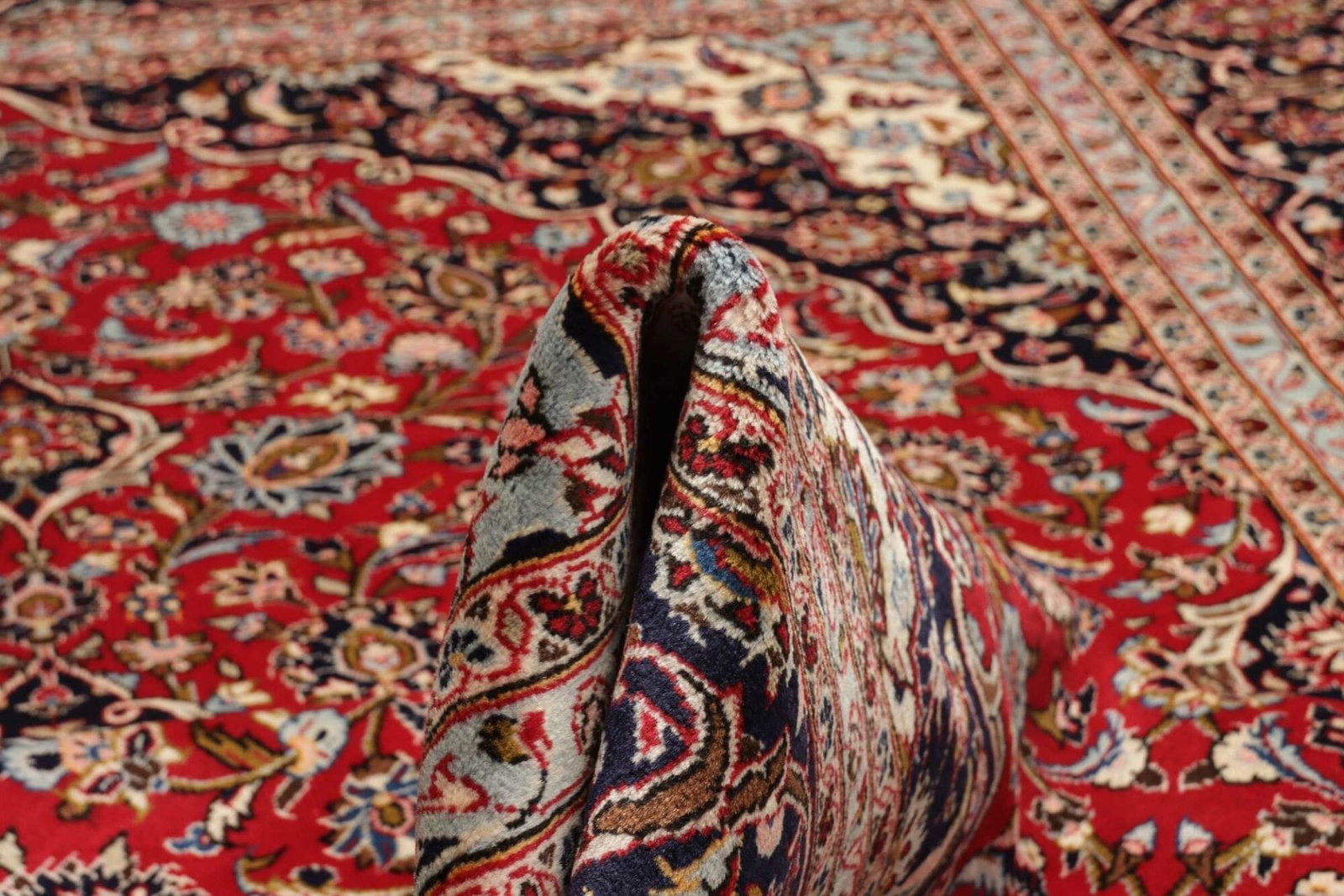 Der Kashan Teppich ist nicht nur ein einfacher Bodenbelag, sondern ein Stück lebendige Geschichte, das Ihrem Raum Charakter verleiht. Seine Strapazierfähigkeit macht ihn ideal für Wohn- und Esszimmer, während die luxuriöse Textur auch in Schlafzimmern und wenig frequentierten Bereichen zur Geltung kommt. Dieser Teppich ist ein geschätztes Erbstück, das mit der Zeit nur an Schönheit gewinnt und für zukünftige Generationen bewahrt bleiben kann.