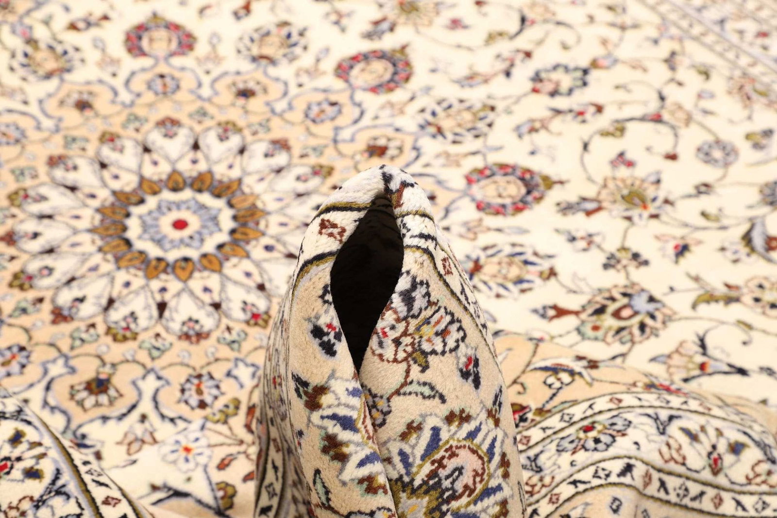 Hergestellt aus 100% Wolle, bietet der Kashan Teppich nicht nur eine weiche und angenehme Textur, sondern auch hervorragende Langlebigkeit und Strapazierfähigkeit. Wolle ist von Natur aus schmutzabweisend und sorgt dafür, dass der Teppich auch bei intensiver Nutzung seine Schönheit behält. Der Teppich ist handgeknüpft, was bedeutet, dass jeder Knoten mit Liebe und Sorgfalt gefertigt wurde. Diese Technik erfordert viel Geduld und Geschick, wodurch die Knotendichte ebenso hoch ist und die Qualität des Teppichs weiter steigert. Ein handgeknüpfter Teppich ist in der Regel auch langlebiger und widerstandsfähiger als maschinell hergestellte Varianten.