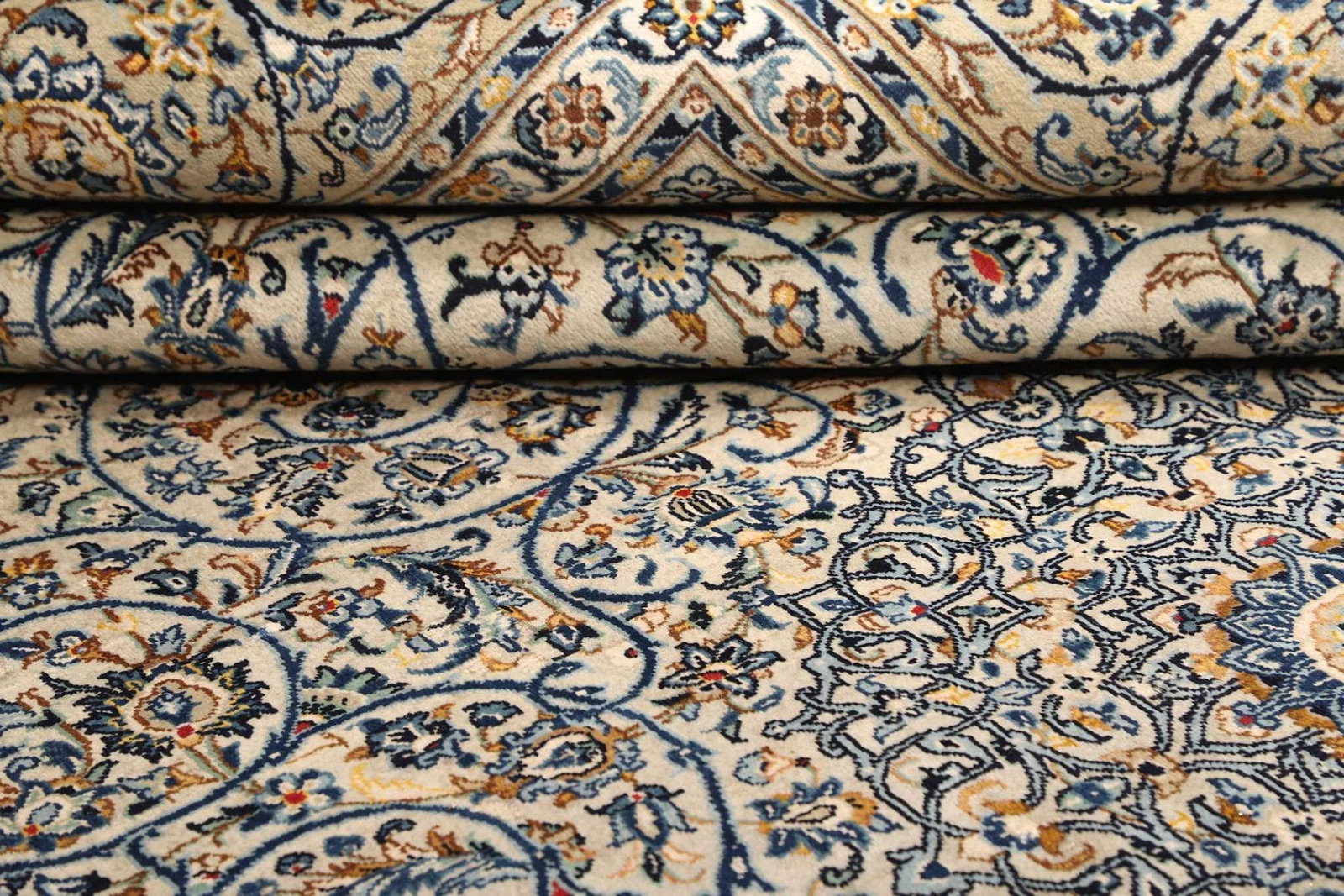 Der florale Stil des Kashan Teppichs zieht sich durch das gesamte Design und schafft ein harmonisches Gesamtbild, das sowohl klassische als auch moderne Einrichtungsstile ergänzt. Florale Muster wie Ranken, Blumen und botanische Elemente sind so angeordnet, dass sie den Betrachter in die Schönheit der Natur eintauchen lassen. Die Farbpalette ist oft reichhaltig und vielfältig, wobei tiefes Rot, Blau und Goldtöne vorherrschen. Diese Farben entstammen traditionellen Färbeverfahren und verleihen dem Teppich Tiefe und lebendige Ausdrucksstärke.