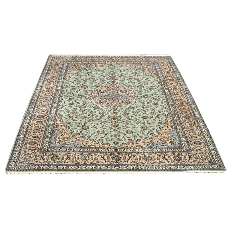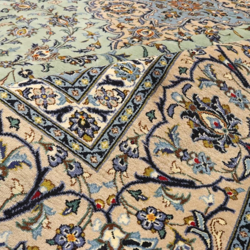 Kashan Teppich 404×316 cm, hellgrün, handgeknüpft, Orientteppich