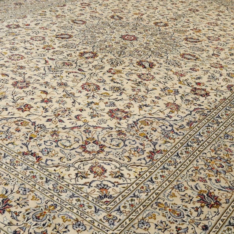 Kashan Teppich | Knotendichte: 200.000-250.000 Knoten/m² | Material: Hochwertige Wolle und Baumwolle | Größe: 415×299 cm | Farbe: Creme mit grauen Rändern | Muster: Traditionelles Design mit modernen Verzierungen | Zustand: Neuzeitlich (0-20 Jahre) | Herkunft: Iran / Persien | Verarbeitung: Handgeknüpft | Dicke: ca. 8 mm | Gewicht: ca. 40 kg