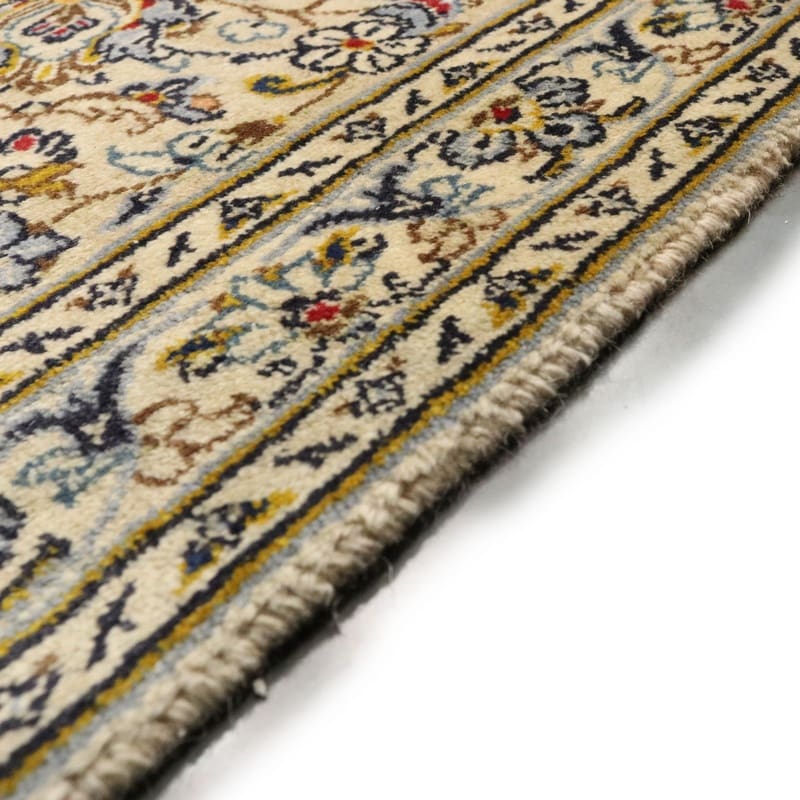 Das Design des Kashan Teppichs ist geprägt von einem harmonischen Zusammenspiel aus klassischen und modernen Elementen. Der helle Creme-Hintergrund wird durch elegante graue Ränder ergänzt. Diese harmonische Farbpalette schafft eine ruhige Atmosphäre, die ideal für jede Einrichtung ist, egal ob im Wohn- oder Schlafzimmer. Die floralen Muster, die oft in Kombination mit geometrischen Formen auftreten, verleihen dem Teppich eine besondere Tiefe und Textur.