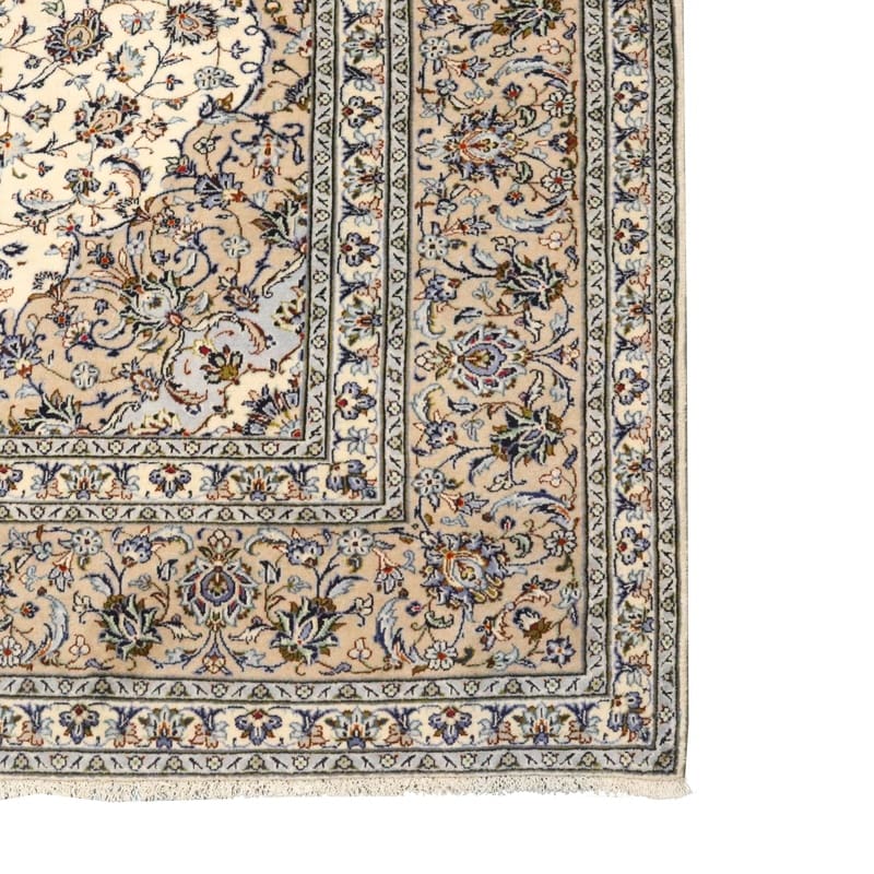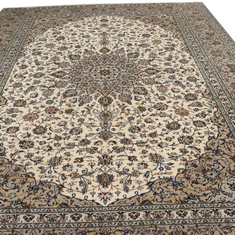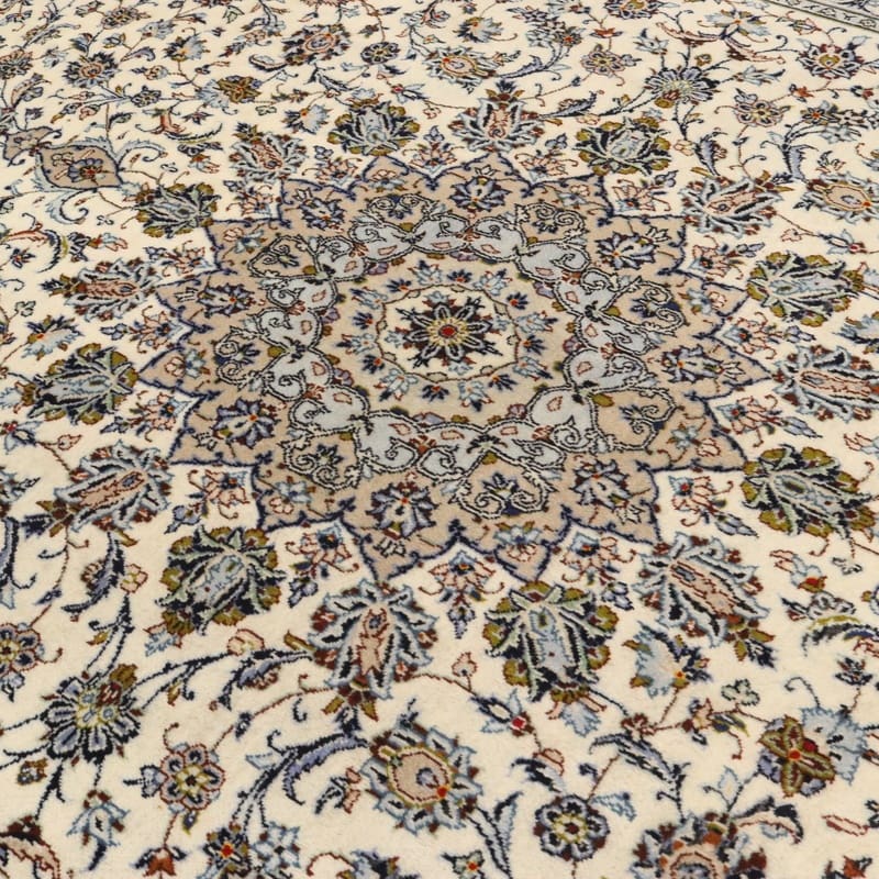 Kashan Teppich | Knotendichte: 200.000-250.000 Knoten/m² | Material: Hochwertige Wolle | Größe: 419×309 cm | Farbe: Weiß/Beige | Zustand: Neuzeitlich (0-20 Jahre) | Ursprung: Iran / Persien | Verarbeitung: Handgeknüpft | Dicke: ca. 8 mm | Gewicht: ca. 18 kg