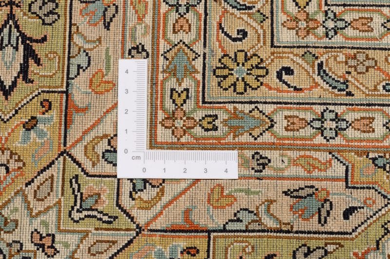 Der Designfokus dieses Teppichs liegt in seiner harmonischen Farbgebung und dem komplexen Muster, das sowohl traditionell als auch zeitlos ist. Die harmonischen Farbnuancen schaffen eine beruhigende Atmosphäre und sind zudem flexibel genug, um sich in unterschiedliche Einrichtungsstile zu integrieren. Die klassischen arabesken Elemente und floralen Darstellungen sind charakteristisch für die Kunst der Region und verleihen dem Teppich seine einmalige Ästhetik. Die filigranen Muster sind ein Zeichen des Luxus und der Exklusivität, die Sie in jedem Raum zur Geltung bringen können.