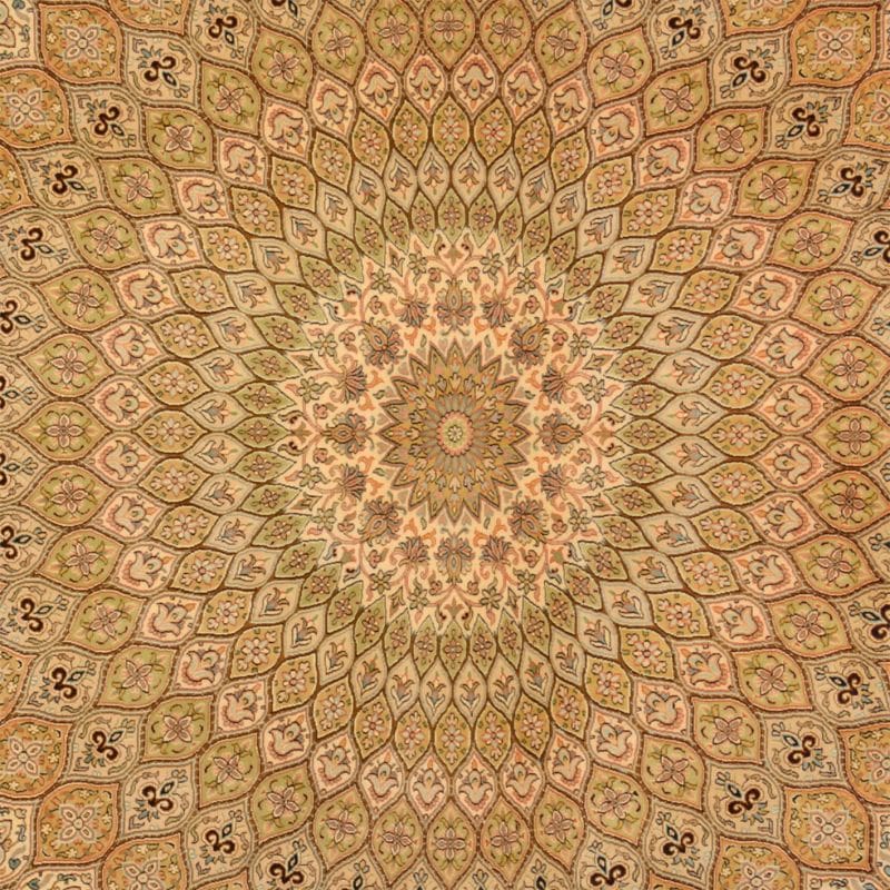 Die Grundlage dieses faszinierenden Teppichs ist die edelste Kashmirseide, die für ihre außergewöhnliche Qualität und Langlebigkeit bekannt ist. Diese besondere Seide sorgt nicht nur für eine angenehme Haptik, sondern auch für einen luxuriösen Glanz, der den Teppich zu einem echten Blickfang macht. Handgeknüpft mit einer Knotendichte von 1.000.000 Knoten vereint dieser Teppich die traditionellen Techniken und das Wissen erfahrener Kunsthandwerker. Jeder Knoten erzählt eine eigene Geschichte und wurde mit größter Sorgfalt und Präzision gefertigt.